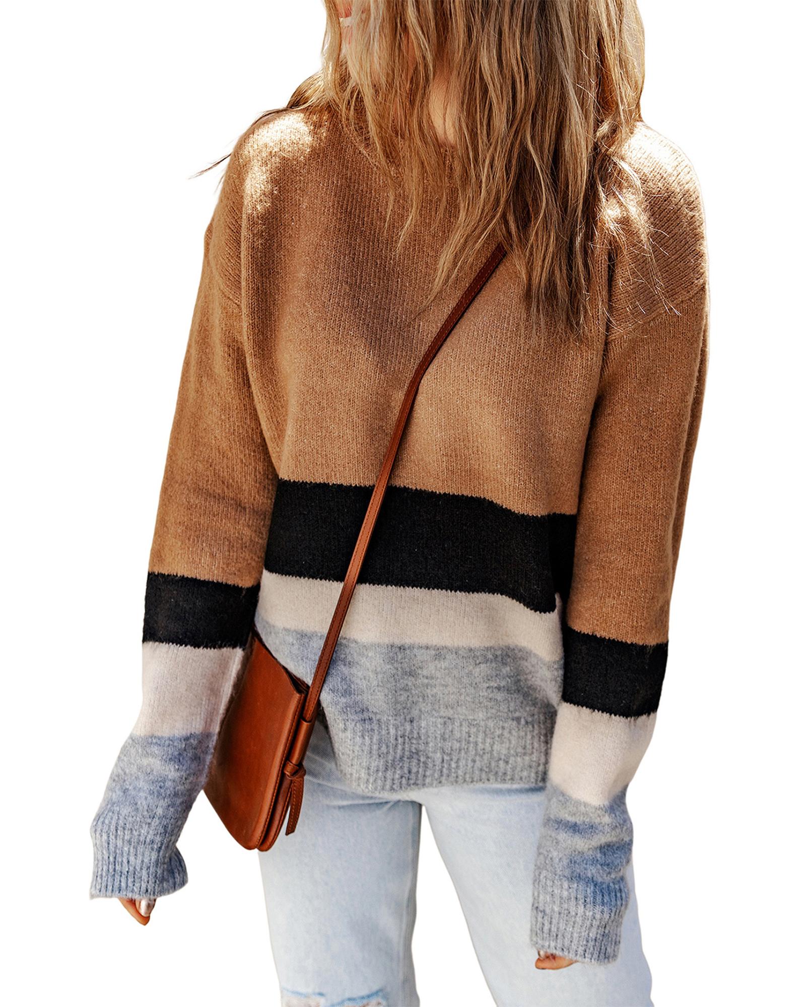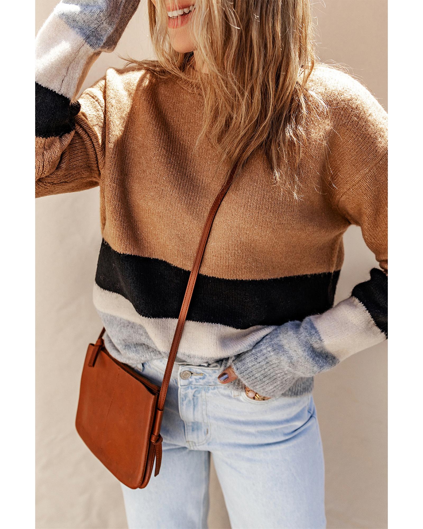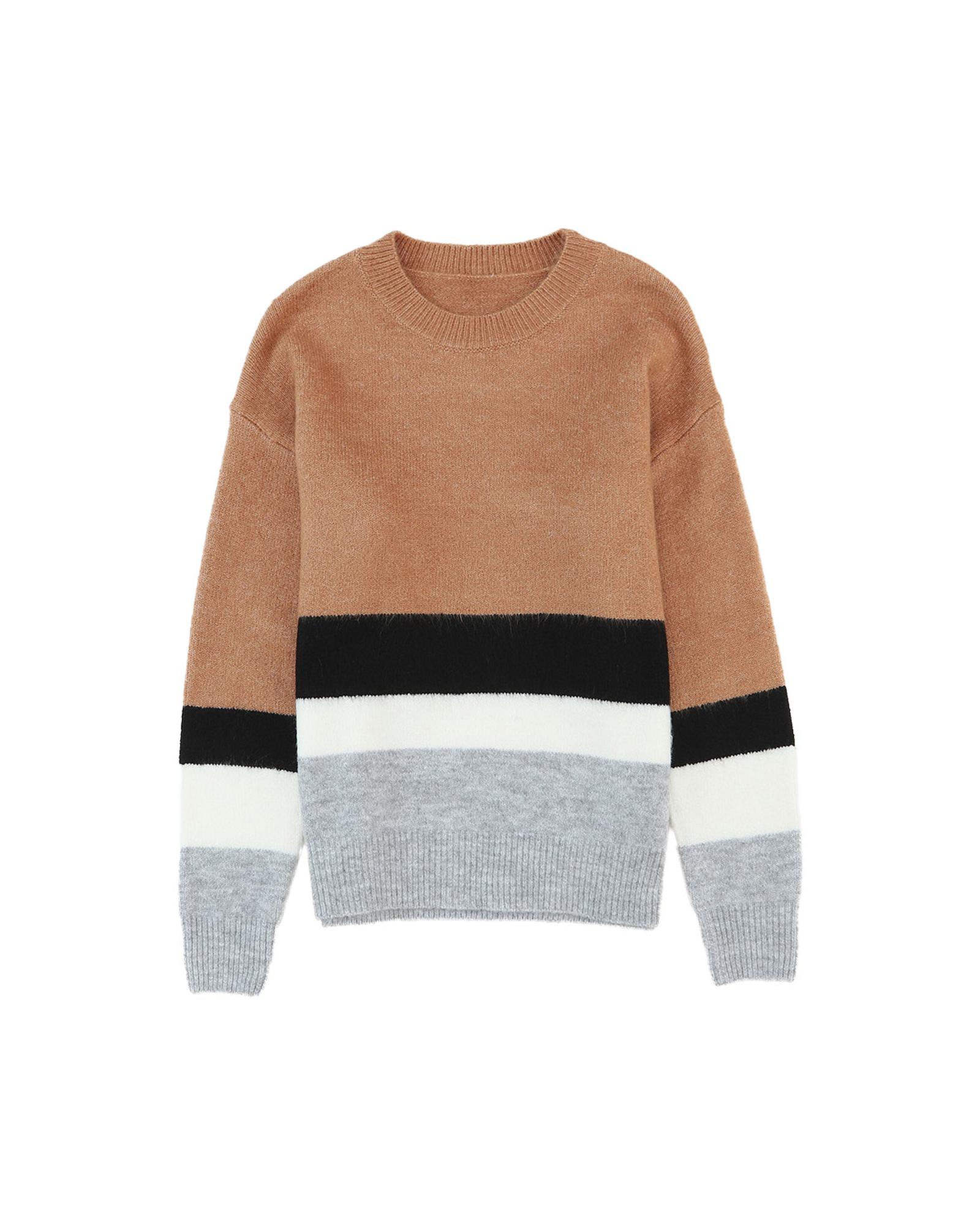 Azura Exchange Brown Color Block Striped Ribbed Knit Sweater – S