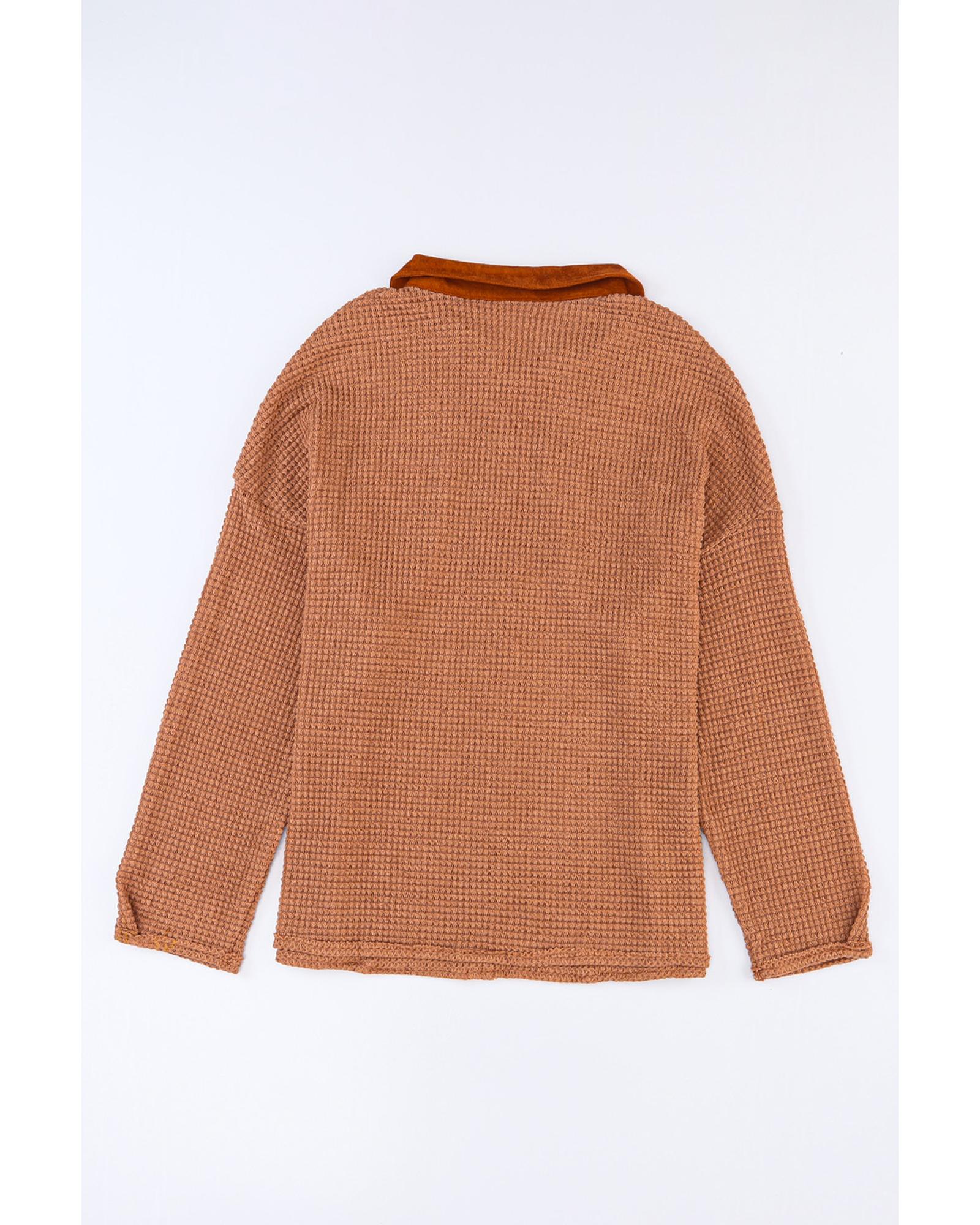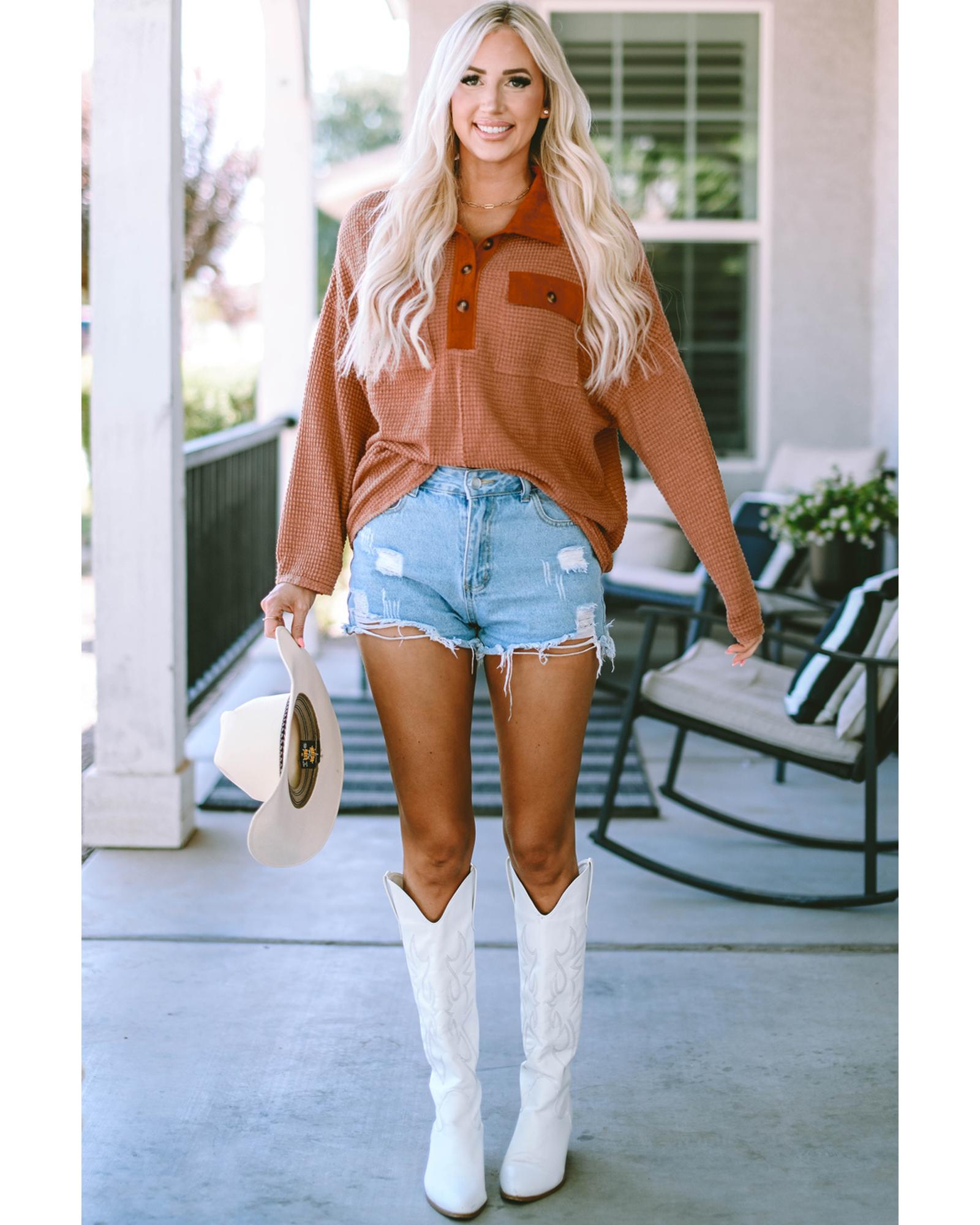 Azura Exchange Button Contrast Trim Waffle Knit Top – L