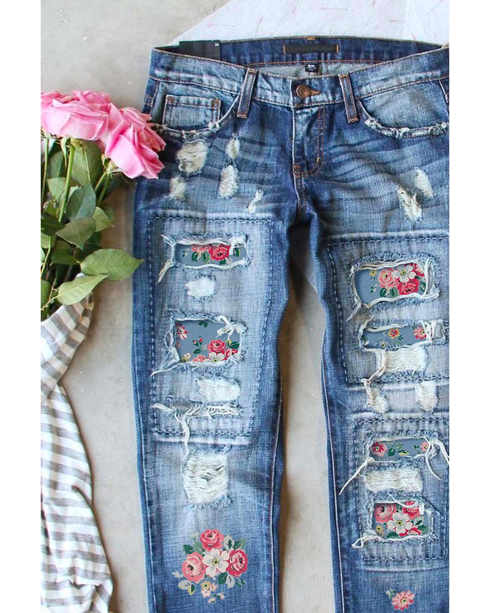 - Floral Print Contrast Distressed Mid Waist Jeans