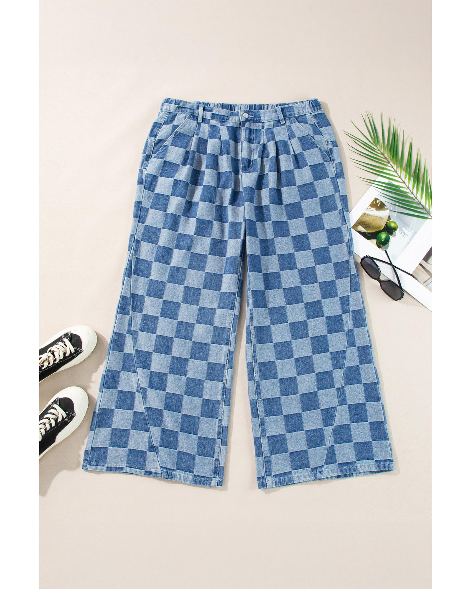 - Dusk Blue Plus Size Checkered Seamed High Waist Wide Leg Jeans