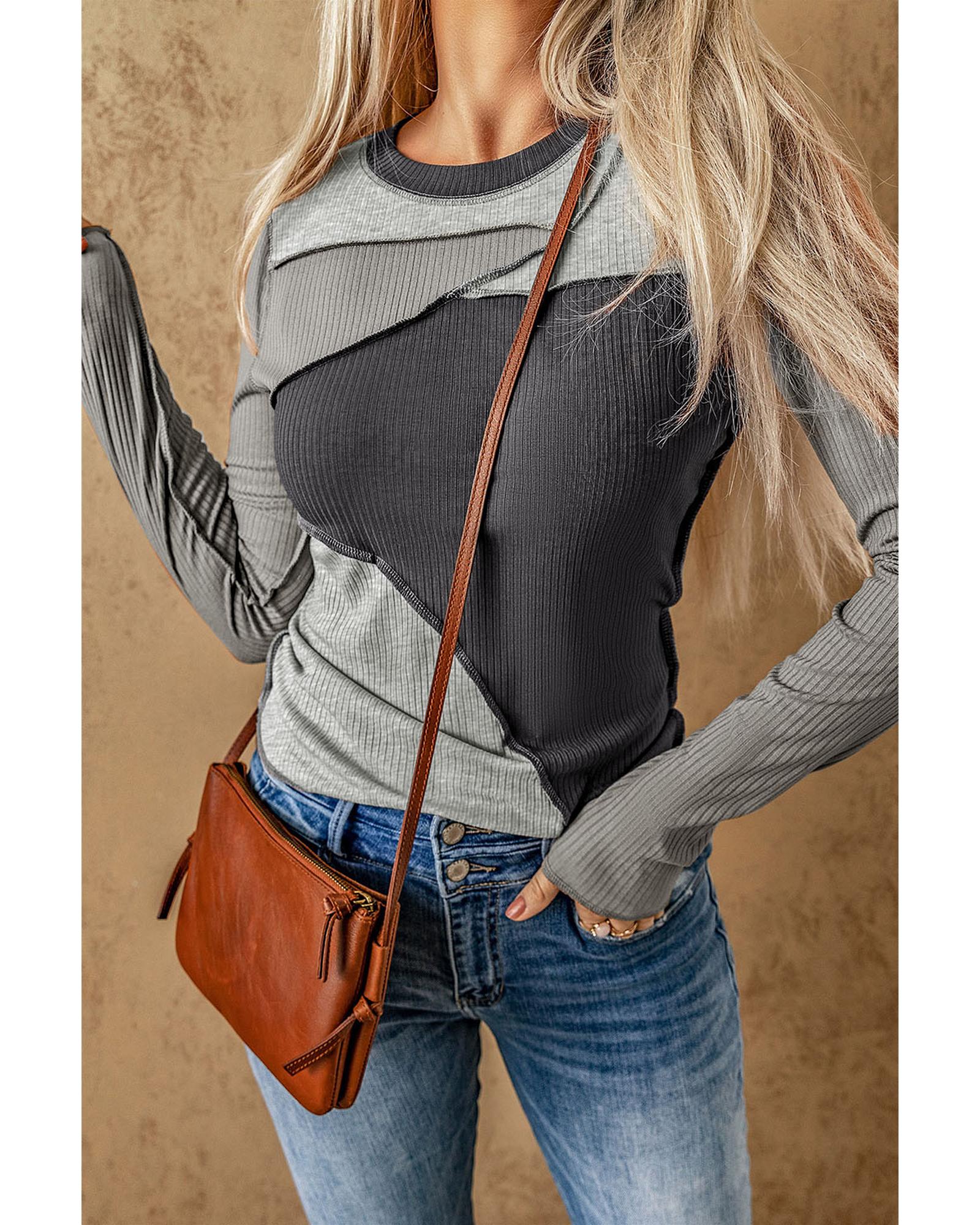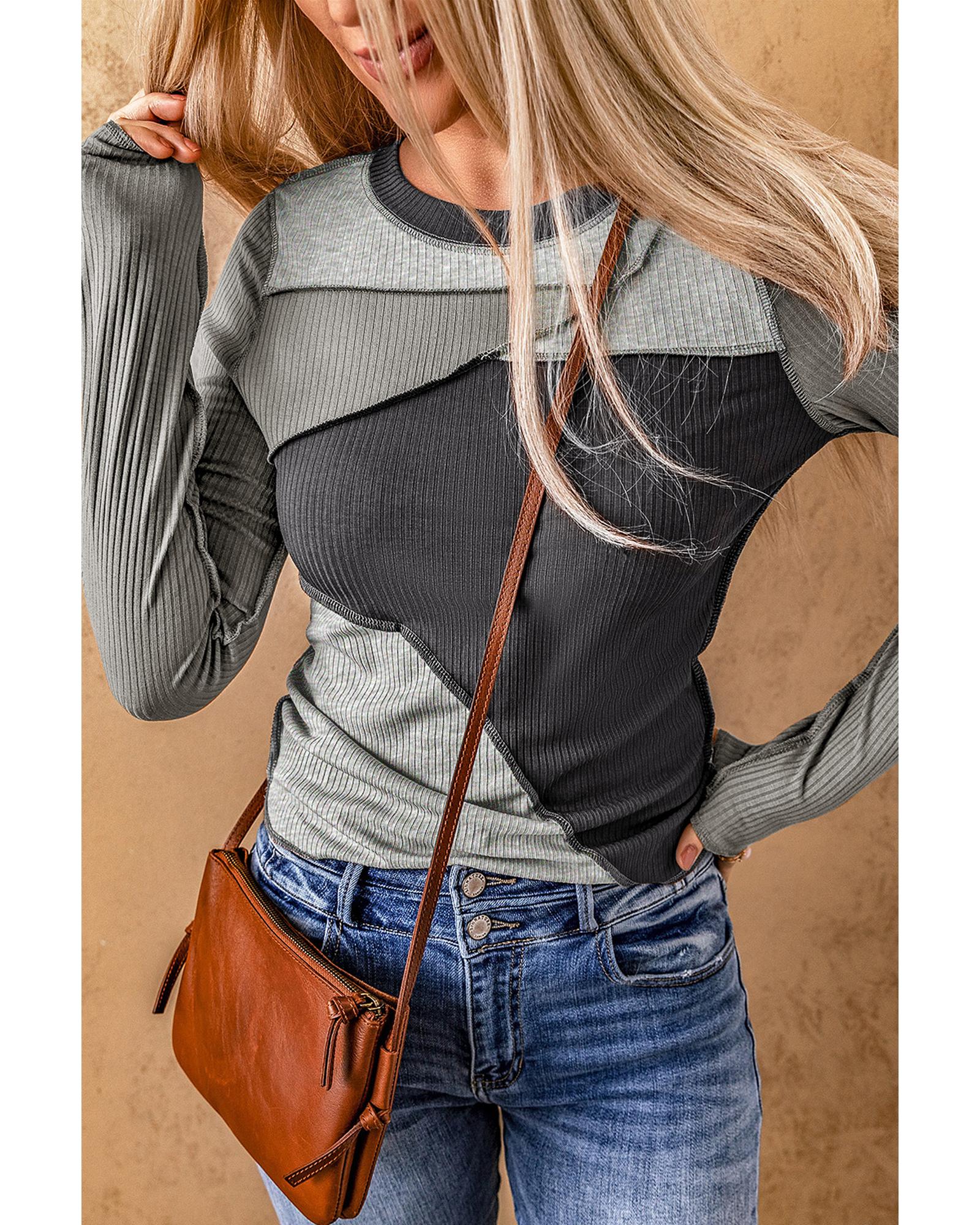 - Gray Expose Seam Color Block Ribbed Knit Top