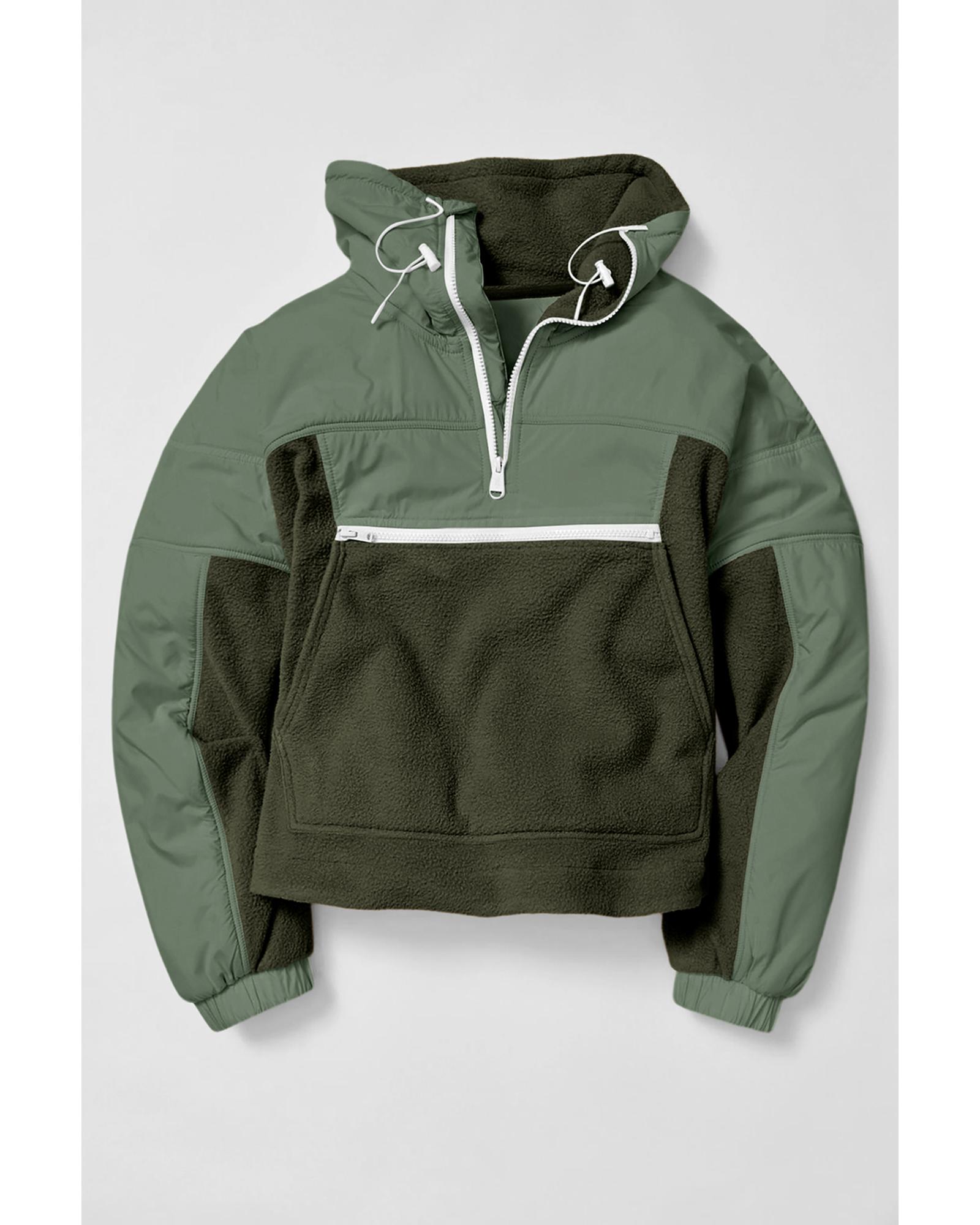 • Green Fleece Patchwork Color Block Zip Funnel Neck Sweatshirt