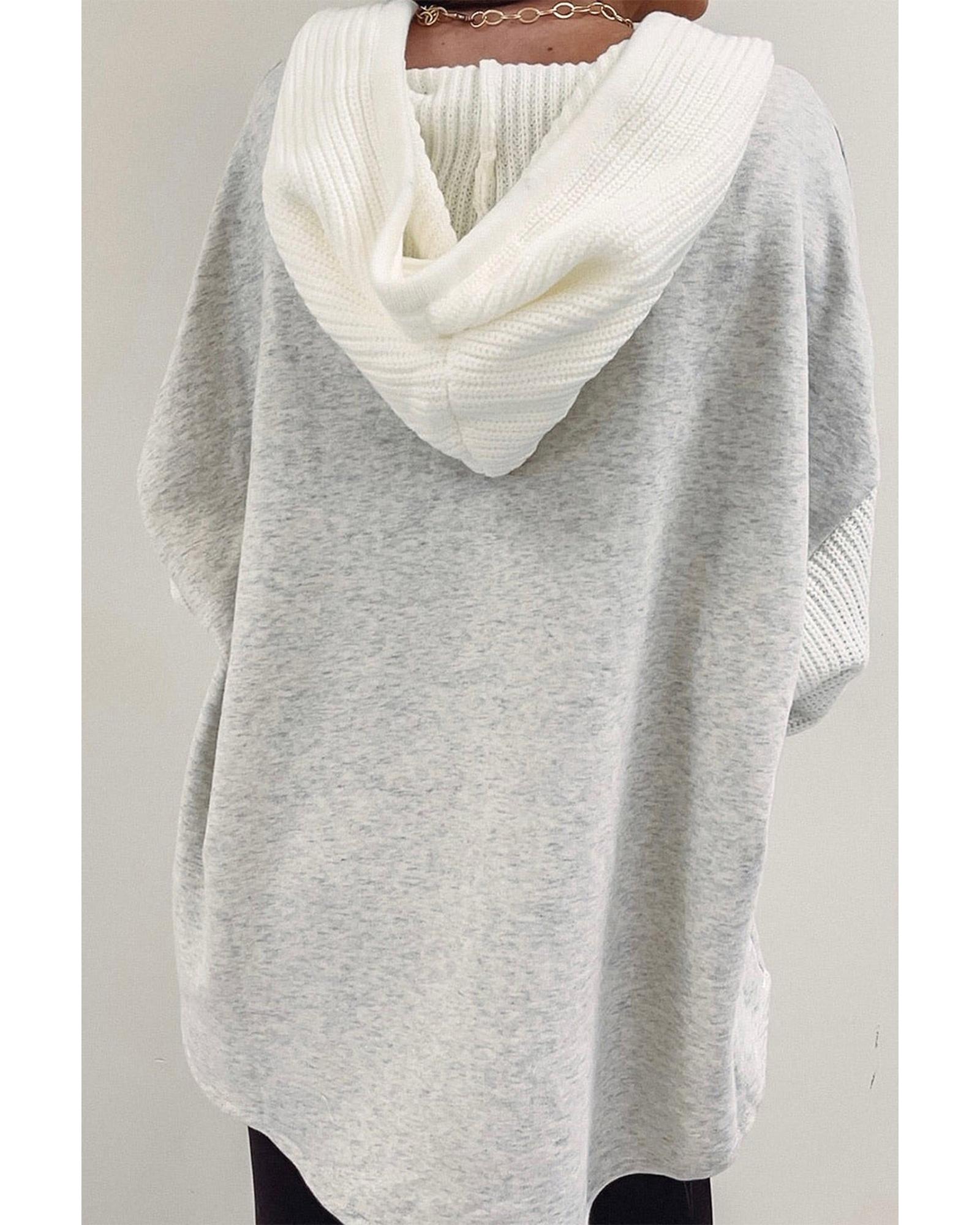 - Stay cozy and stylish with our Gray Button Up Contrast Knitted Sleeves Hooded Jacket
