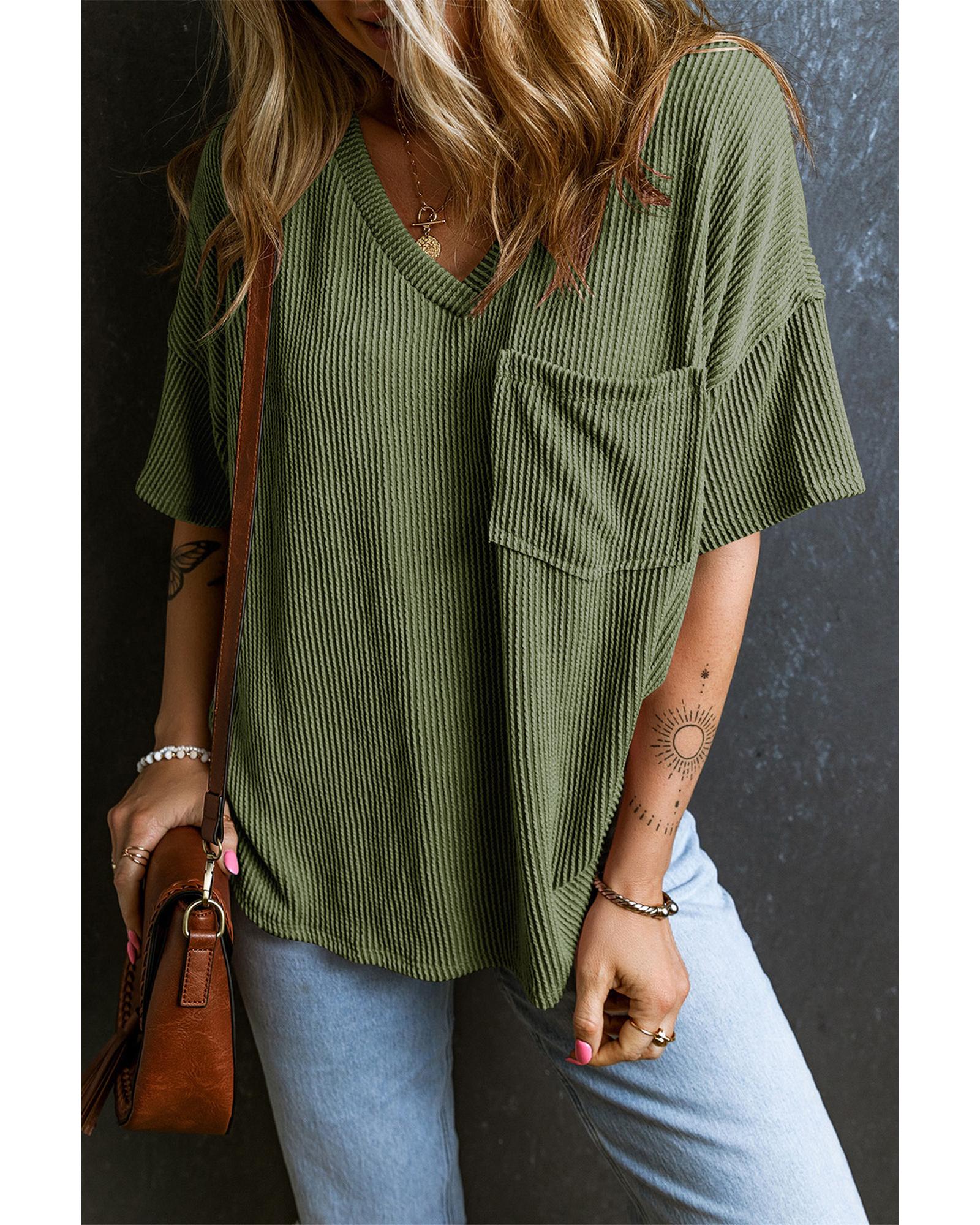 Azura Exchange Jungle Green Corded V Neck Chest Pocket Loose T-shirt – L