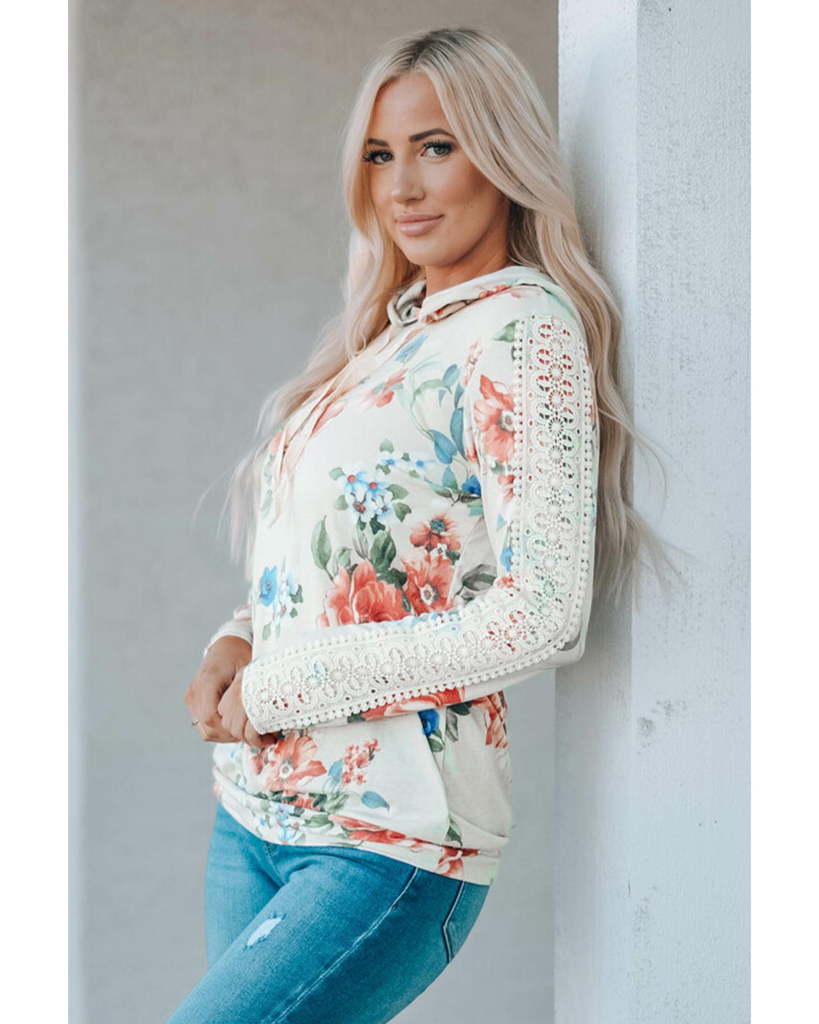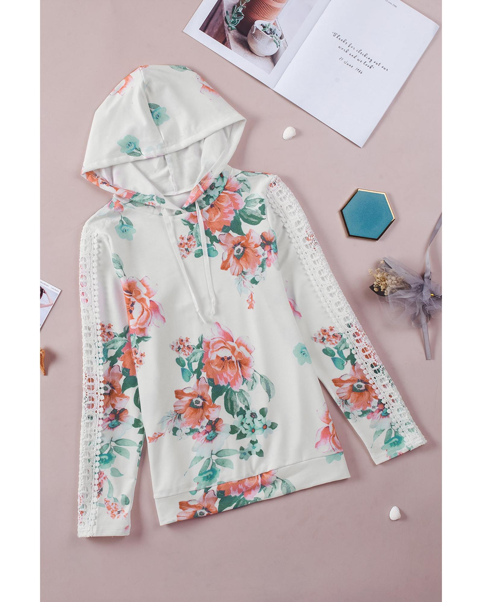 - Stylish and feminine Floral Print Lace Contrast Long Sleeve Hoodie