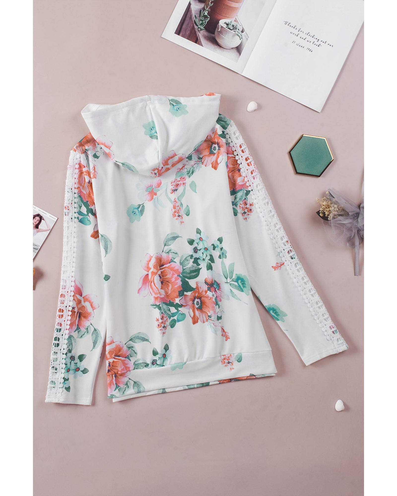 - Stylish and feminine Floral Print Lace Contrast Long Sleeve Hoodie