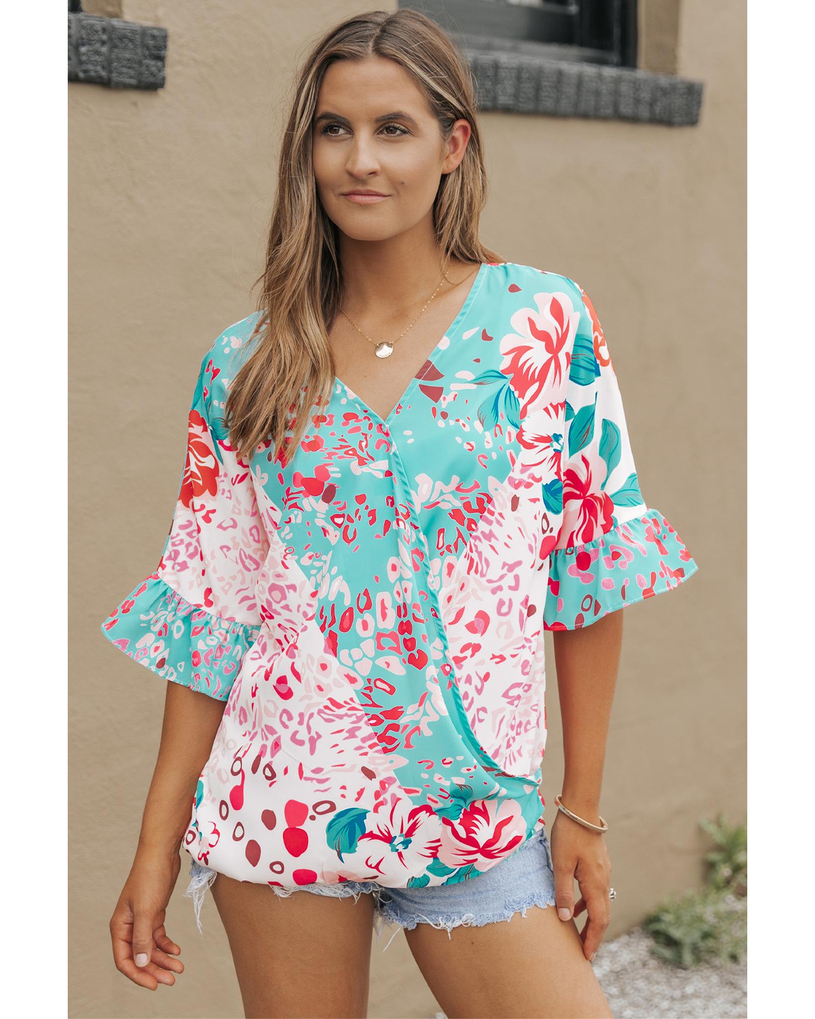 - Trendy and stylish Multicolor Leopard Floral Mixed Print Ruffle Sleeve Surplice Blouse