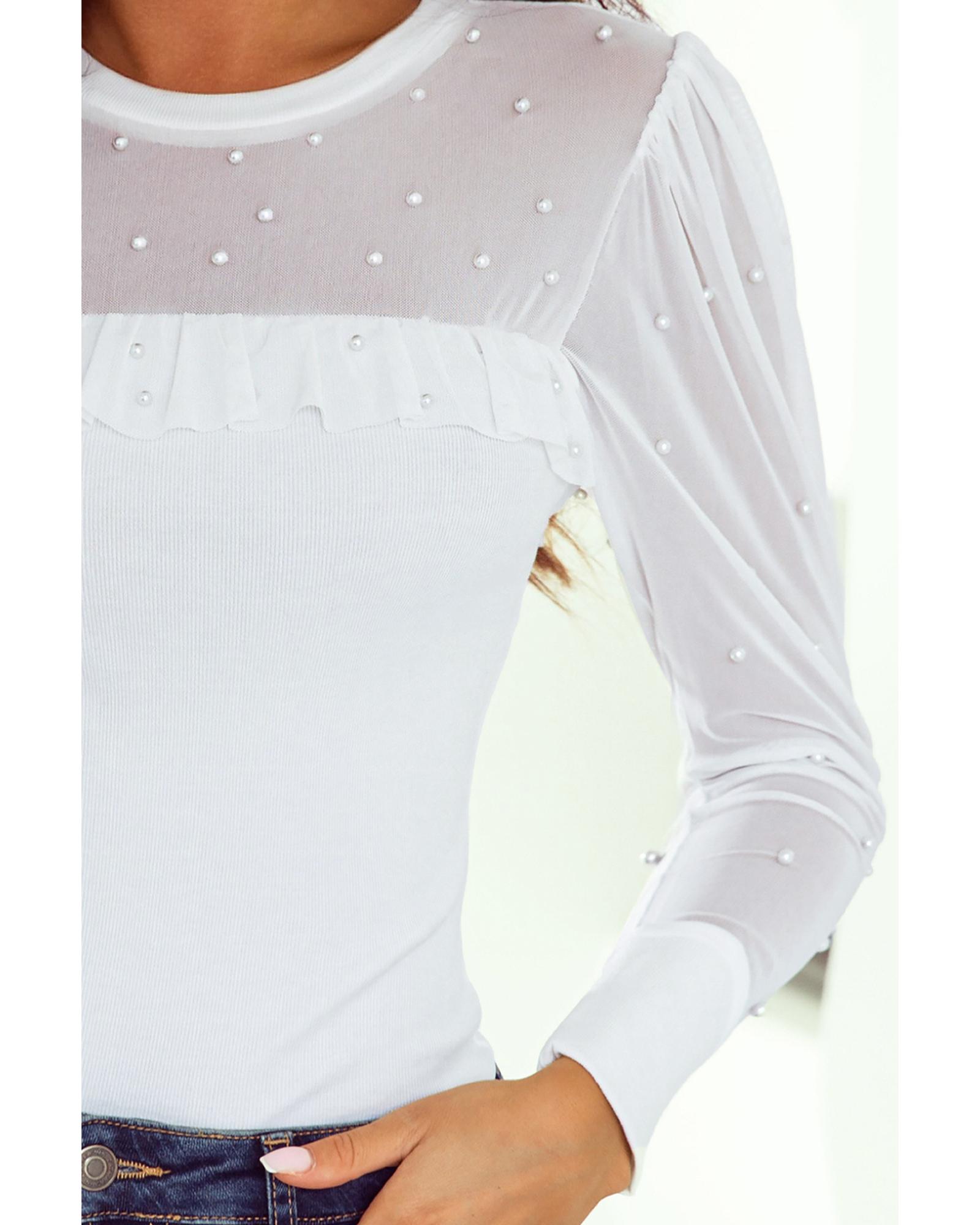 - Stunning Pearl Decor Mesh Patchwork Ribbed Long Sleeve Top