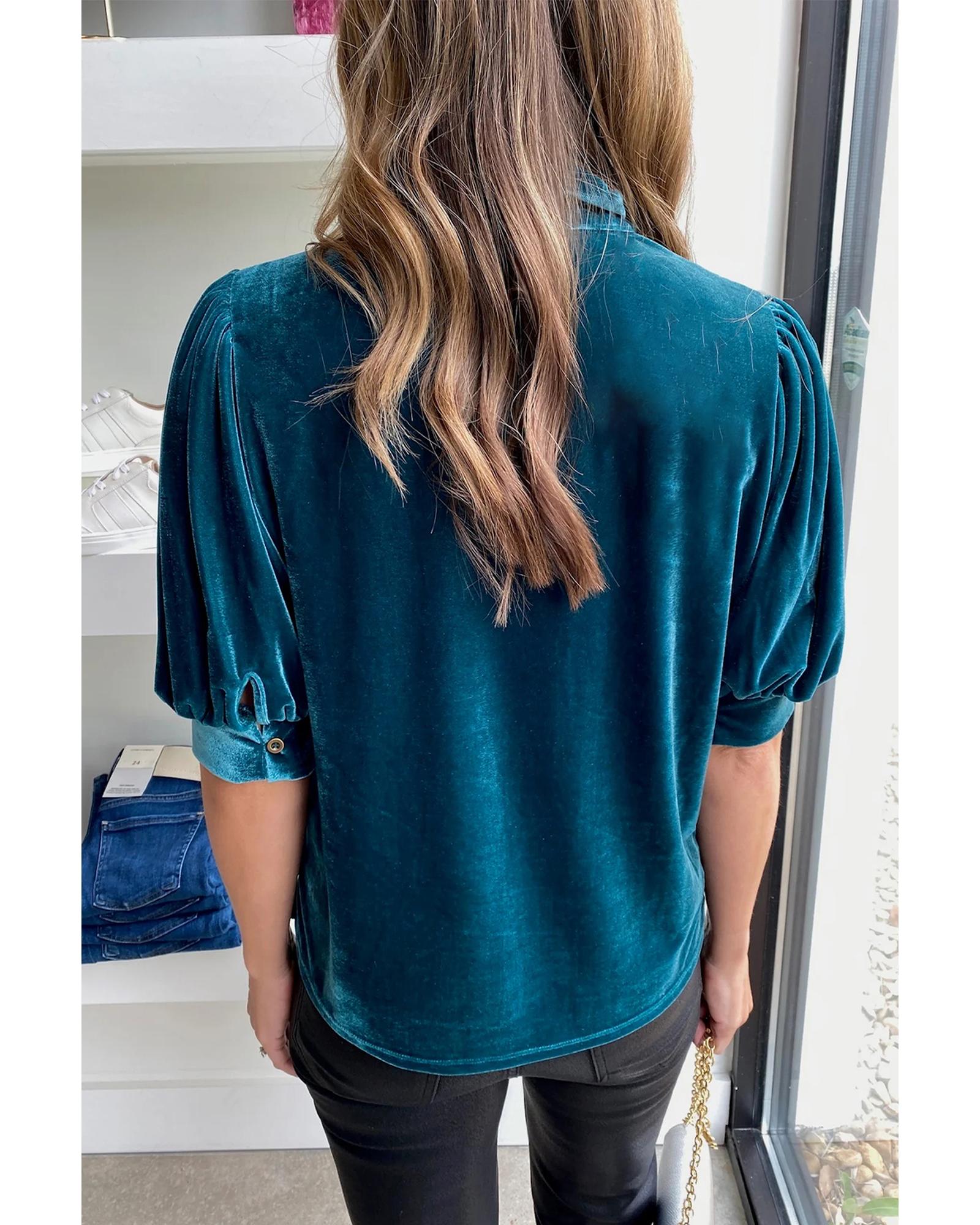 Azura Exchange Peacock Blue Velvet Bow Tie Neck Short Sleeve Top – M