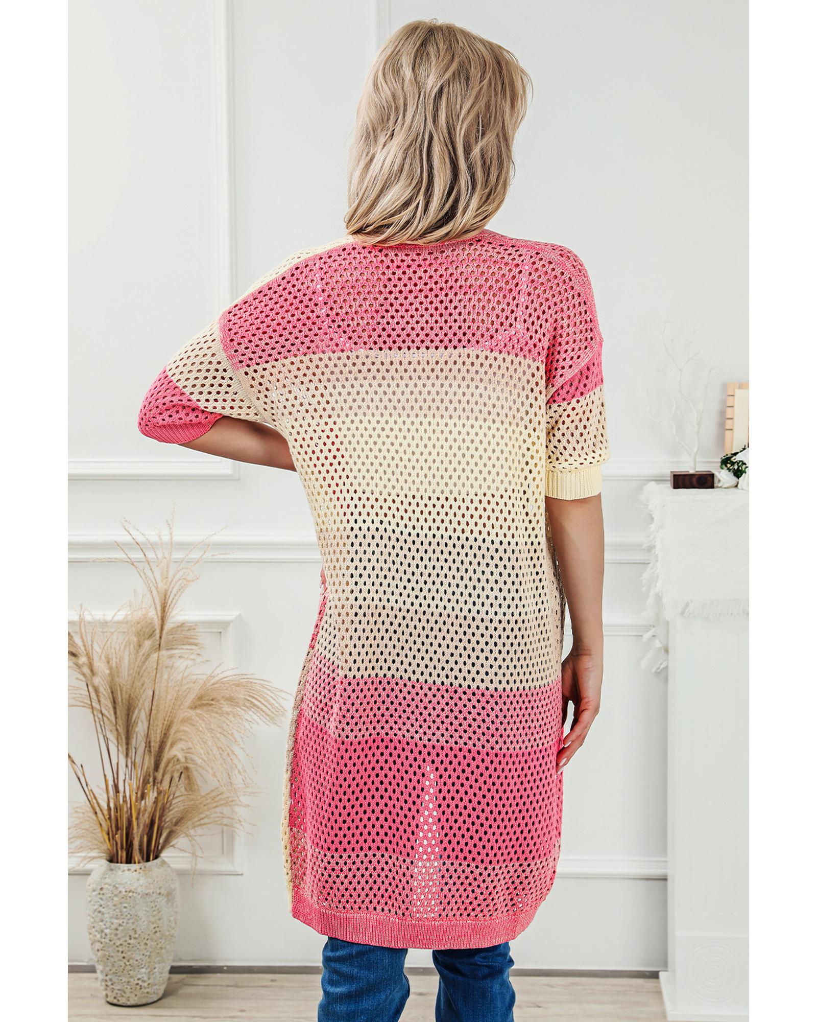 Azura Exchange Pink Ribbed Short Sleeve Ombre Eyelet Knitted Cardigan – M