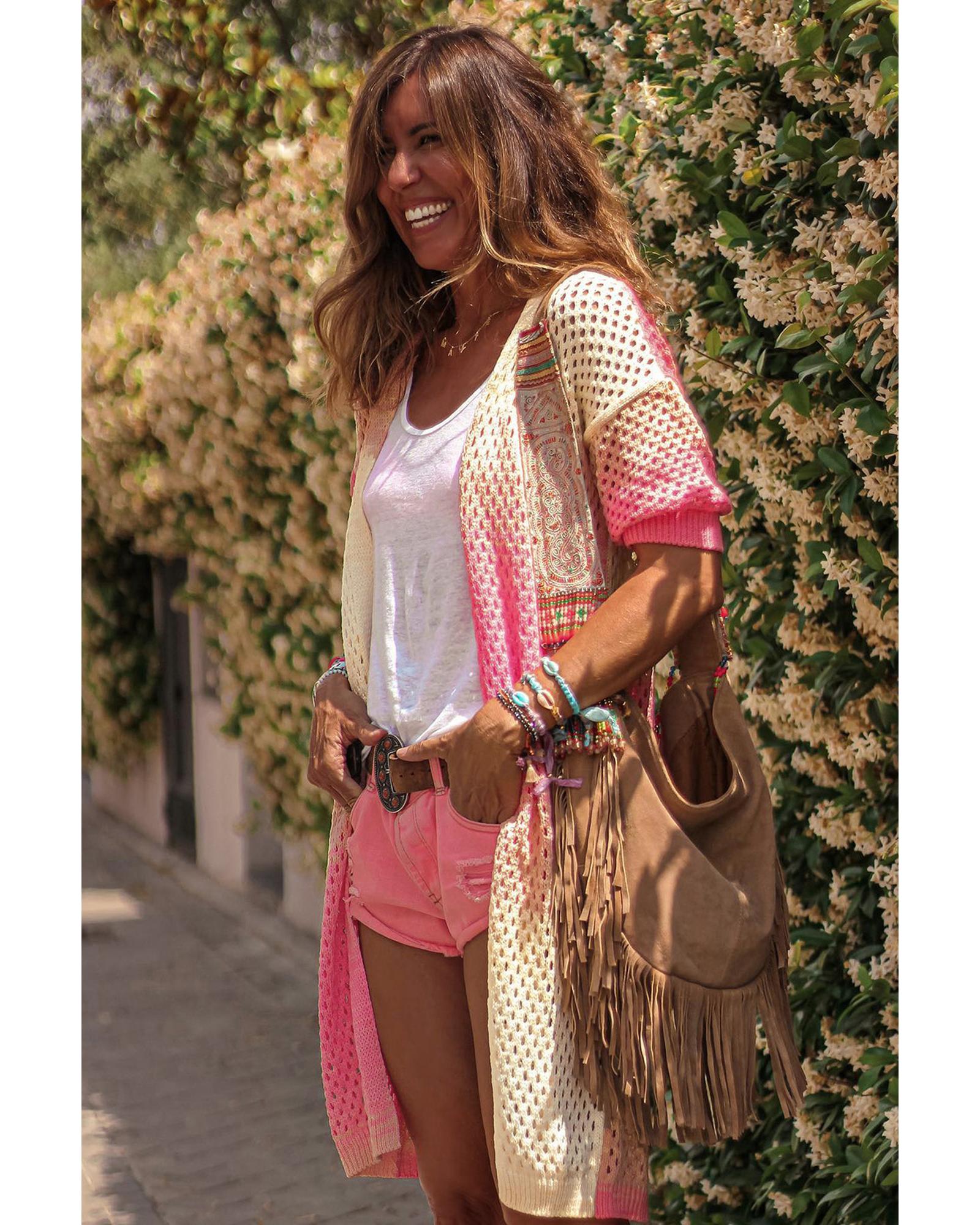 Azura Exchange Pink Ribbed Short Sleeve Ombre Eyelet Knitted Cardigan – XL