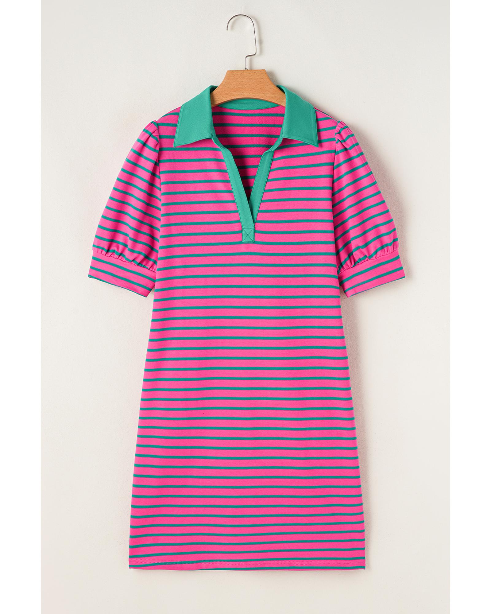 Azura Exchange Pink Stripe Collared V Neck Puff Sleeve T Shirt Dress - S