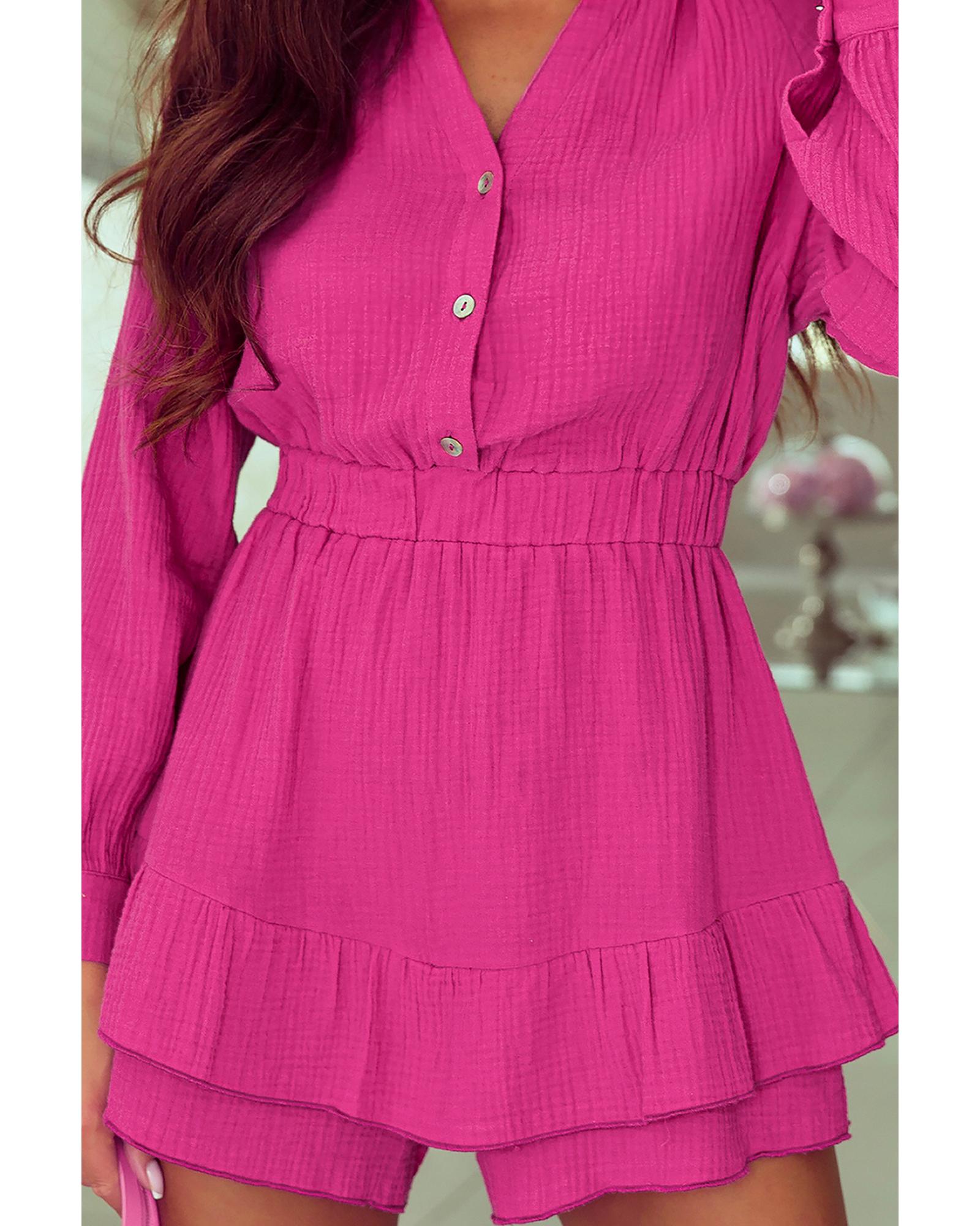 Azura Exchange Rose Textured Tiered Ruffled Buttoned Long Sleeve Romper – M