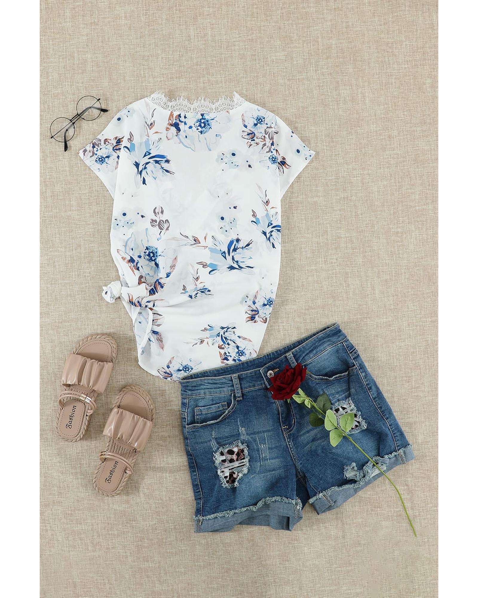 - Floral Scalloped V Neck Short Sleeves Top