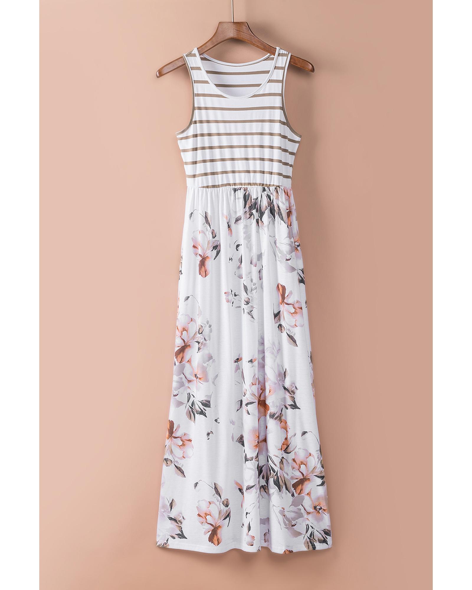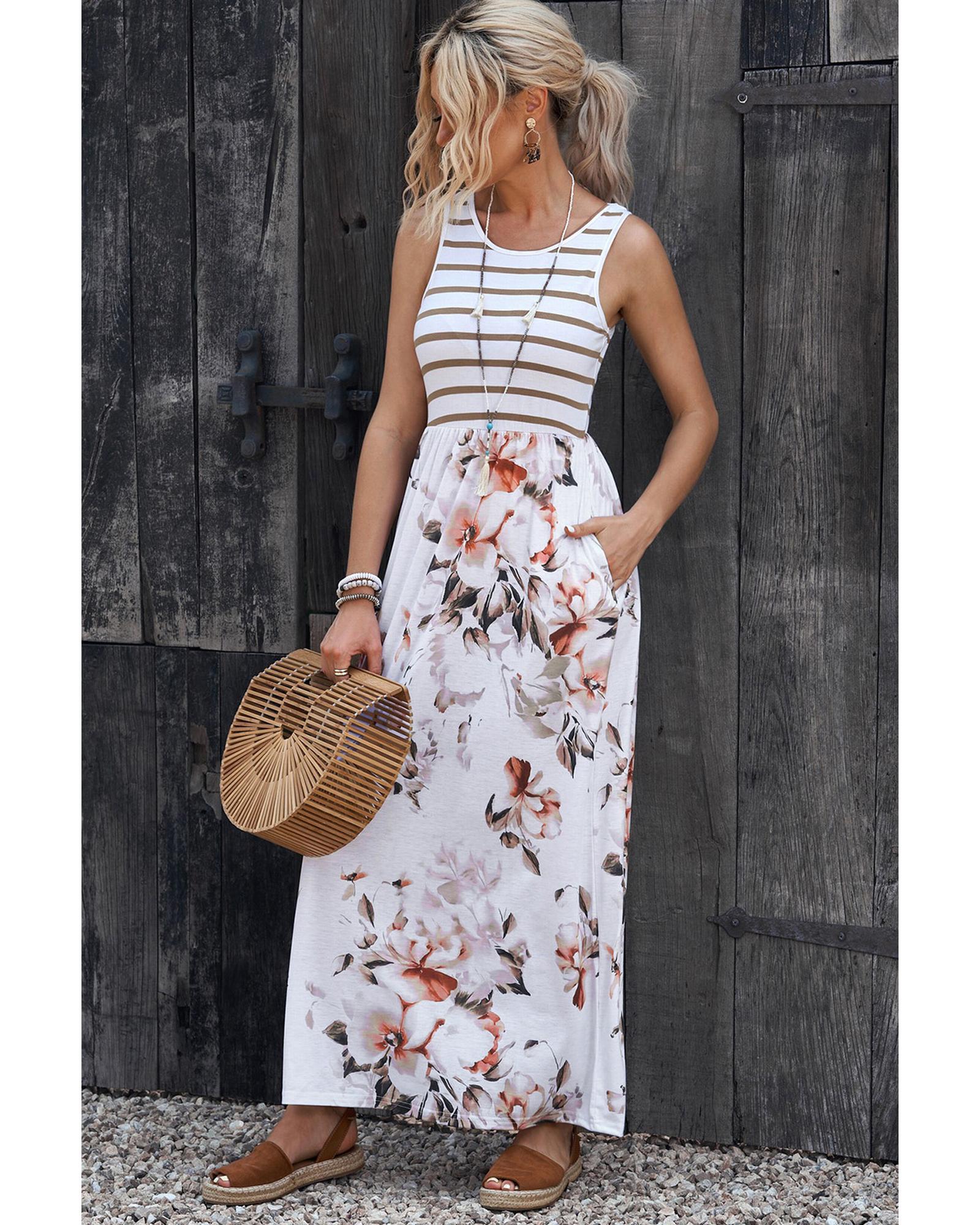 Azura Exchange White Striped Floral Print Sleeveless Maxi Dress with Pocket – S