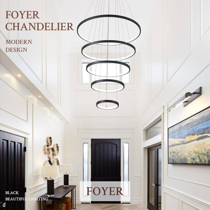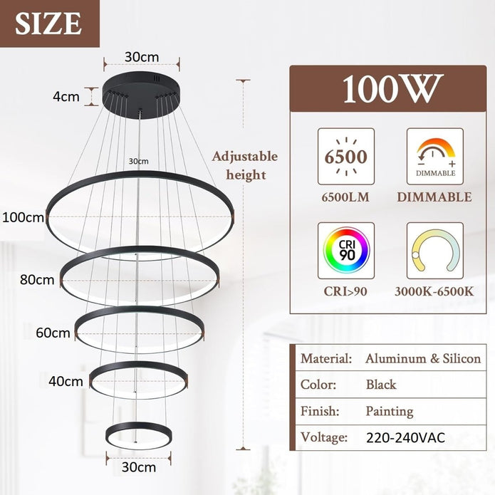 BAMDECOR A18801 Modern LED Chandelier, Dimmable Pendant Light with Remote Control Rings Round Ceiling Lighting Fixture 3 Color Temperatures Contemporary Chandeliers (5 Rings-Black)