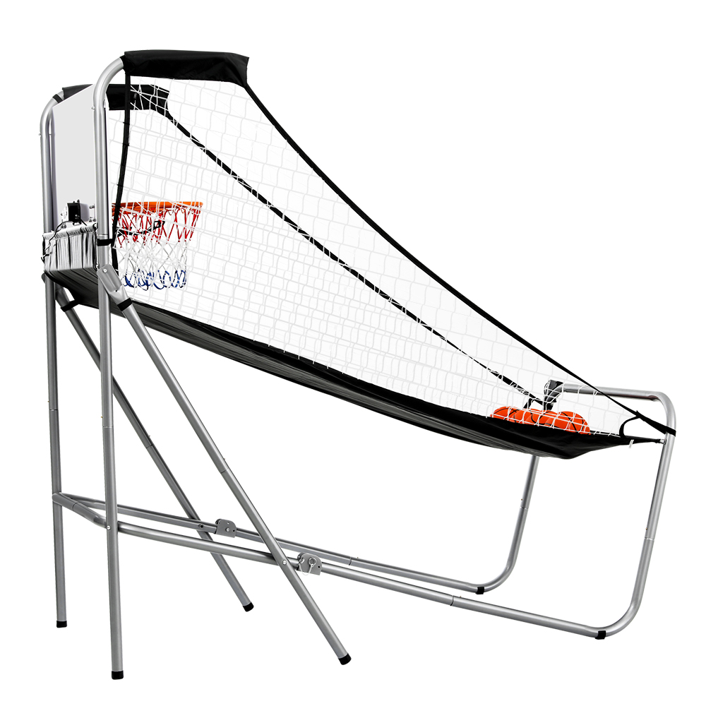 Bring the thrill of the arcade home with your very own Basketball Shooting Machine. The game is made from quality coated steel tubes that are rust-resistant as well as waterproof and stain-resistant printed polyester fabric that is sturdy and durable, so you can use it indoors or outdoors. Comes with 8 different popular game modes to challenge your friends and family to thrilling games of skill. Realistic sound effects make you feel like youre actually at your local arcade hotspot. The LED automatic score counter provides an accurate and impartial referee for two players, no fighting on the courts! The high net catches stray balls and returns them quickly and easily so you can get back to fun. The triangle frame design and anti-slip feet always keep the game stable. With a foldable, portable and easy-to-assemble velcro design, you can play basketball in minutes, whether at home or on the road. Includes a bonus of four basketballs to always keep the fun rolling. Game on to victory with your very own arcade-style Basketball Shooting Machine.