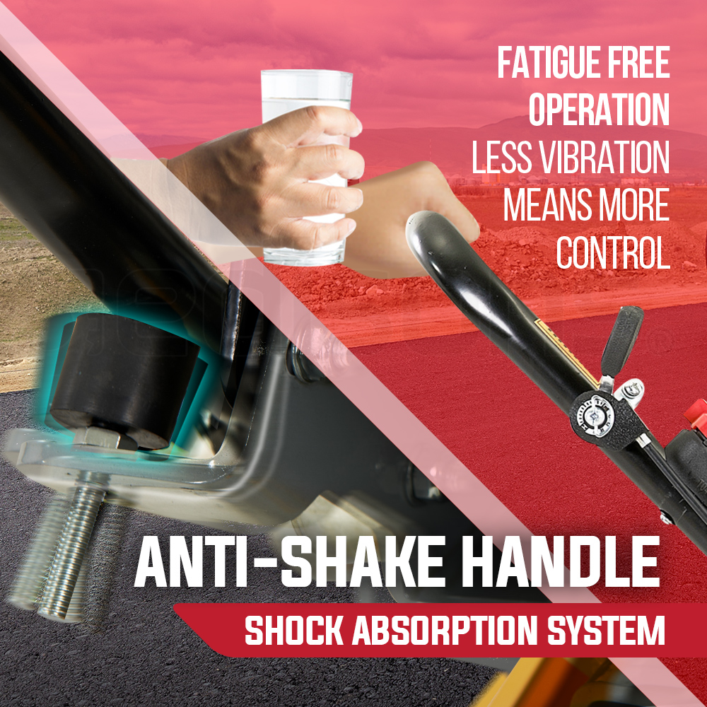 An integrated sprinkler system connected to a large 14L water tank ensures the base plate is kept cool and asphalt adhesion is minimised. Operator comfort is assured by the oversized shock-absorption system integrated into the handles. Unlike other models on the market, transport from job-to-job is no fuss thanks to the retractable wheels, and there is also a lifting hook incorporated into the frame.
