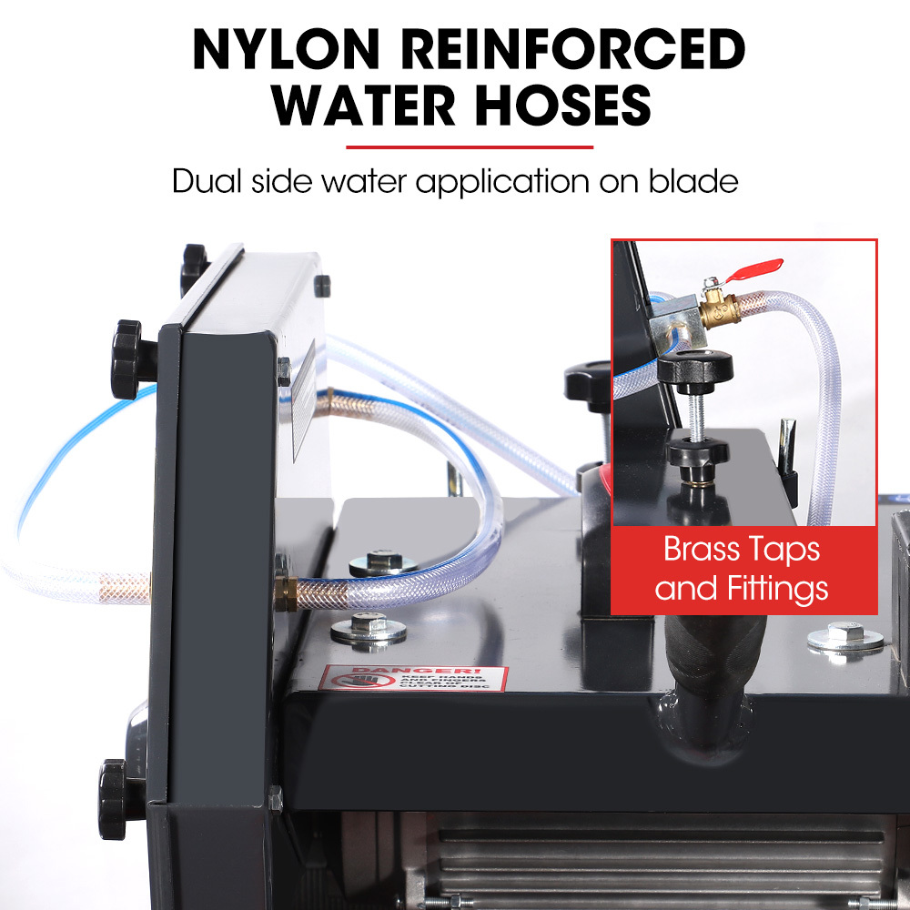 At its core, the BBS450 boasts a potent 2200W motor mounted on a spring loader armature ensuring smooth and precise cutting. The rail effortlessly pivots for bevel cuts, while the wet-cutting system is fueled by a reliable high-volume pump in the undertray reservoir, featuring a shielded water pipe for durability against typical knocks.