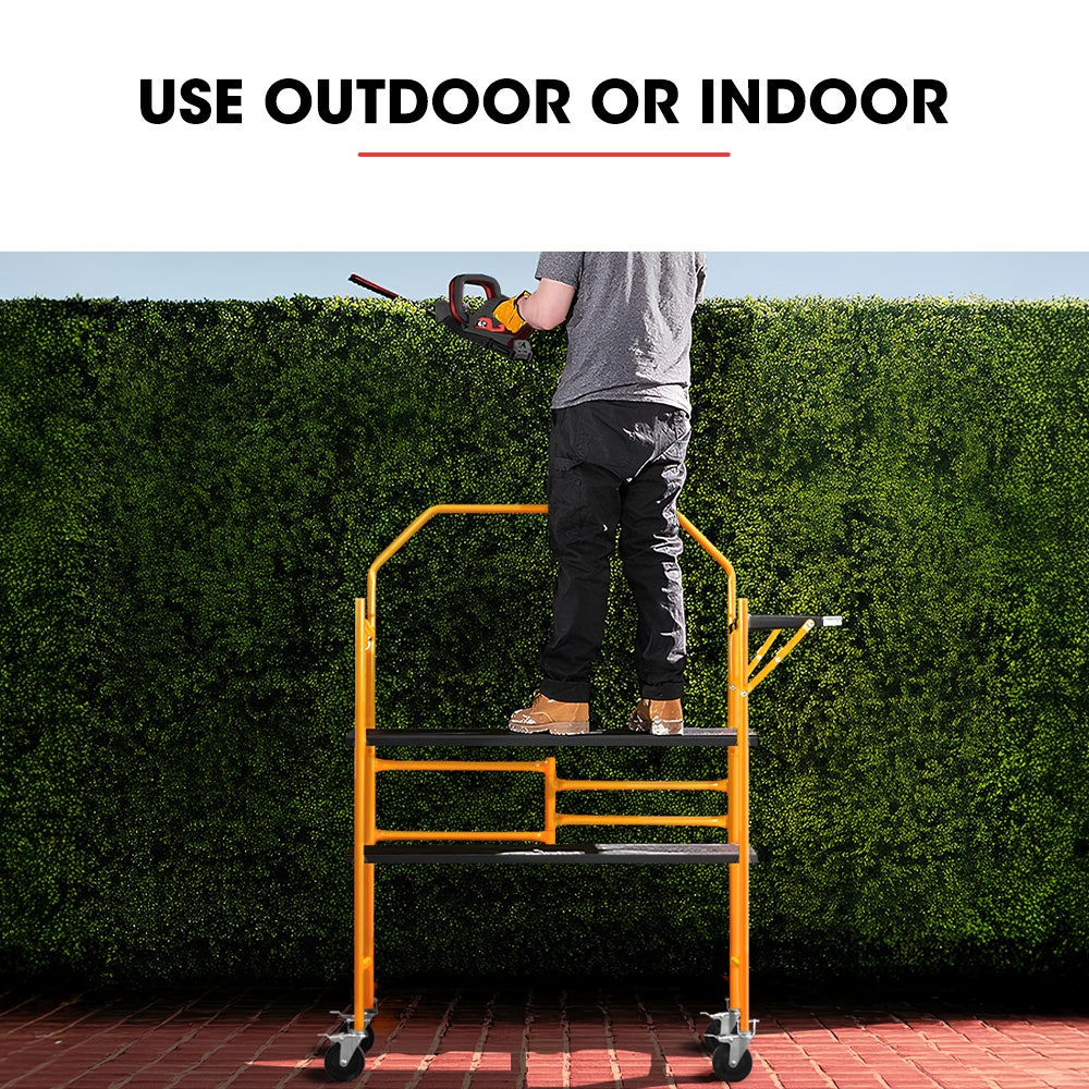 The scaffold includes a built-in tool tray and equipment hooks, keeping your essential tools within easy reach. The foldable design makes it easy to store and transport, while the safety guard bar ensures extra protection while working at height. Whether painting, renovating, or completing maintenance tasks, this versatile scaffold is designed to help you work smarter and safer.