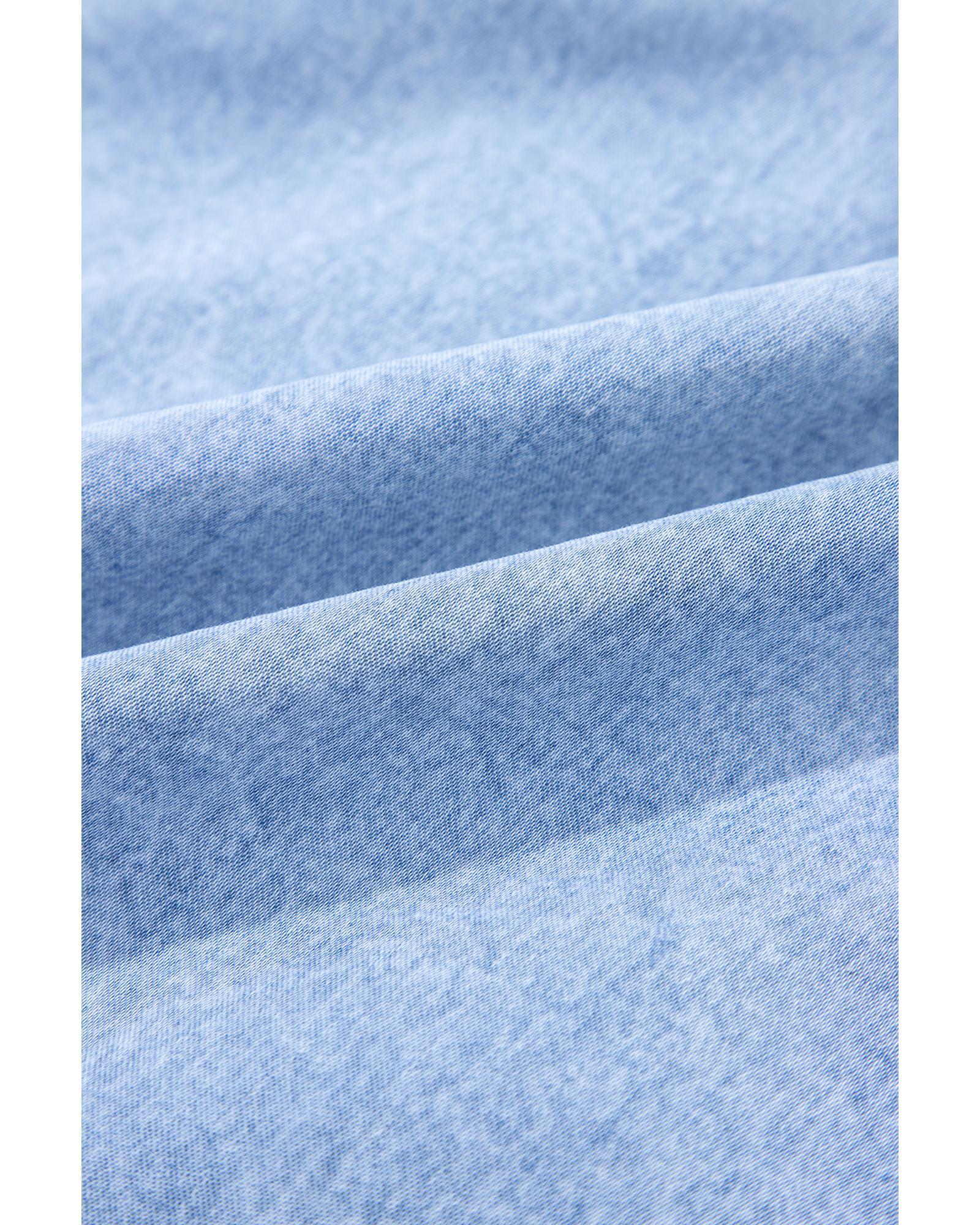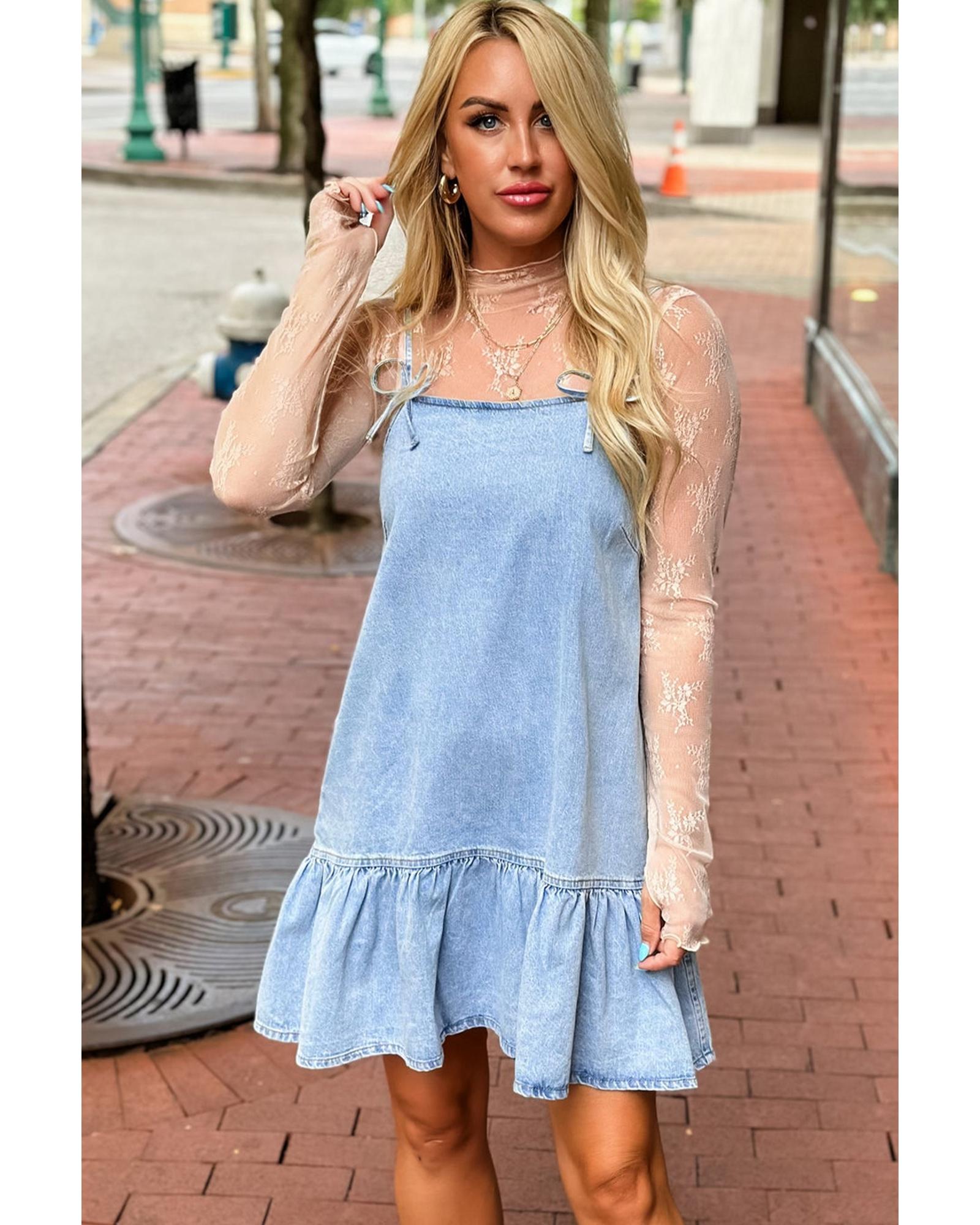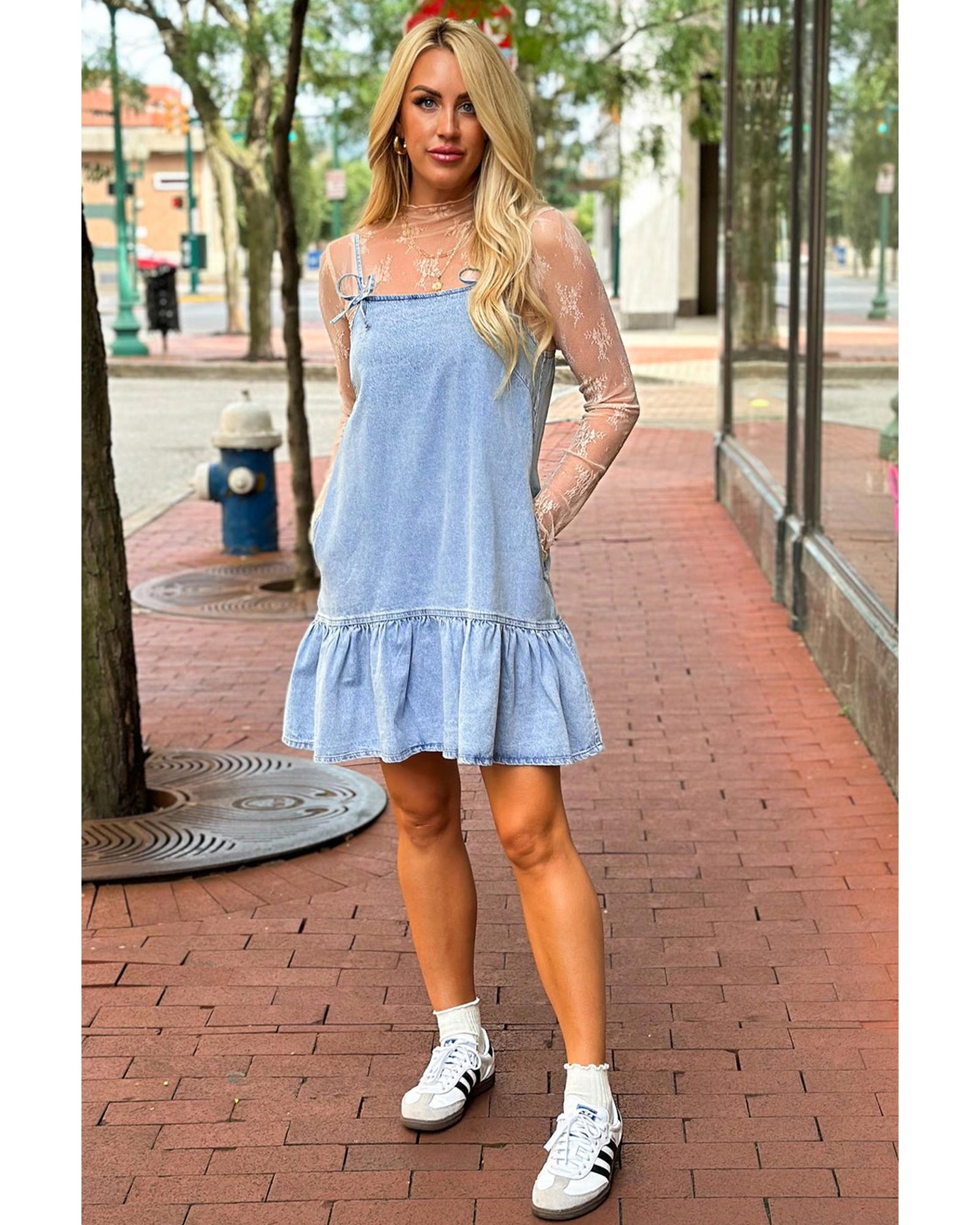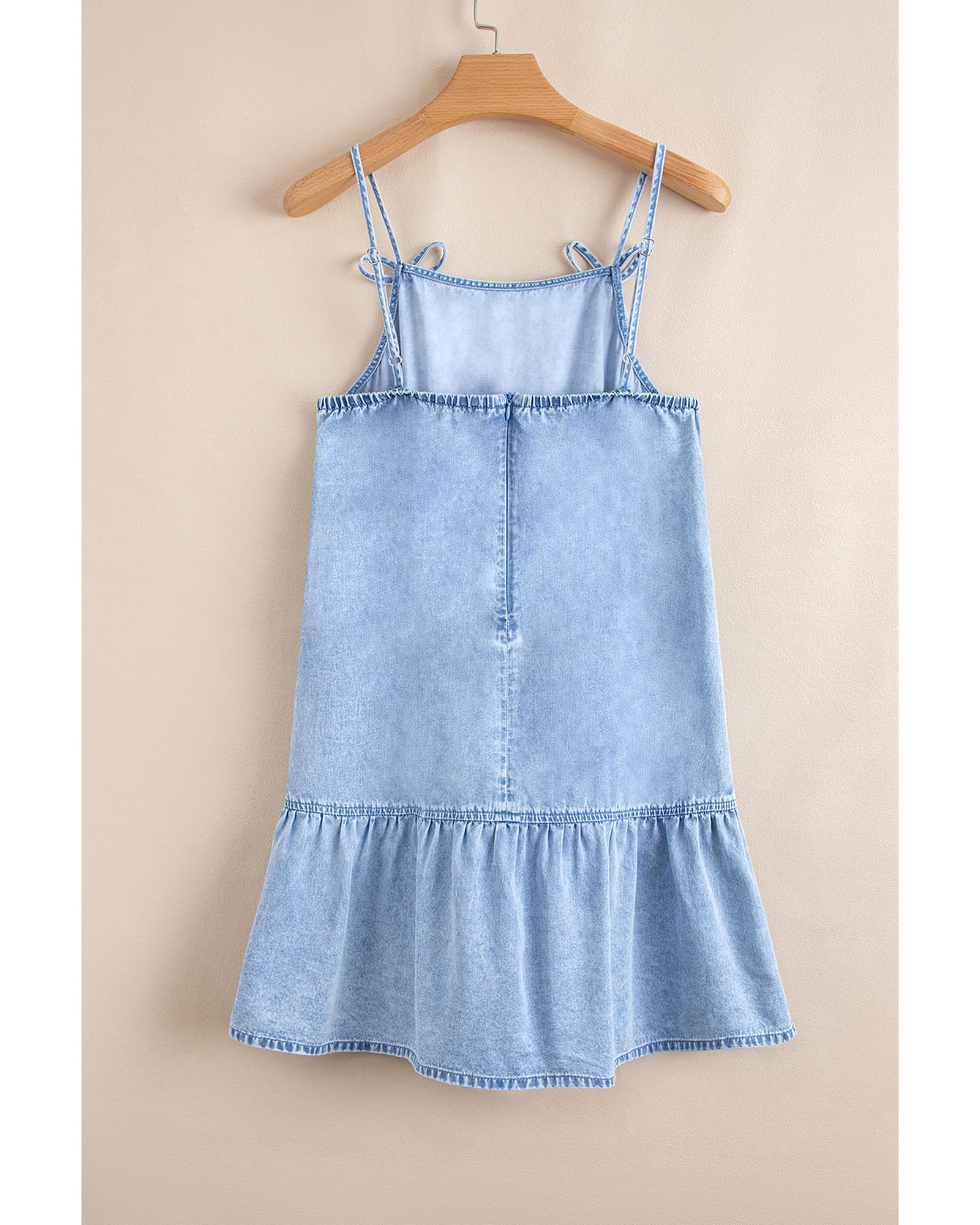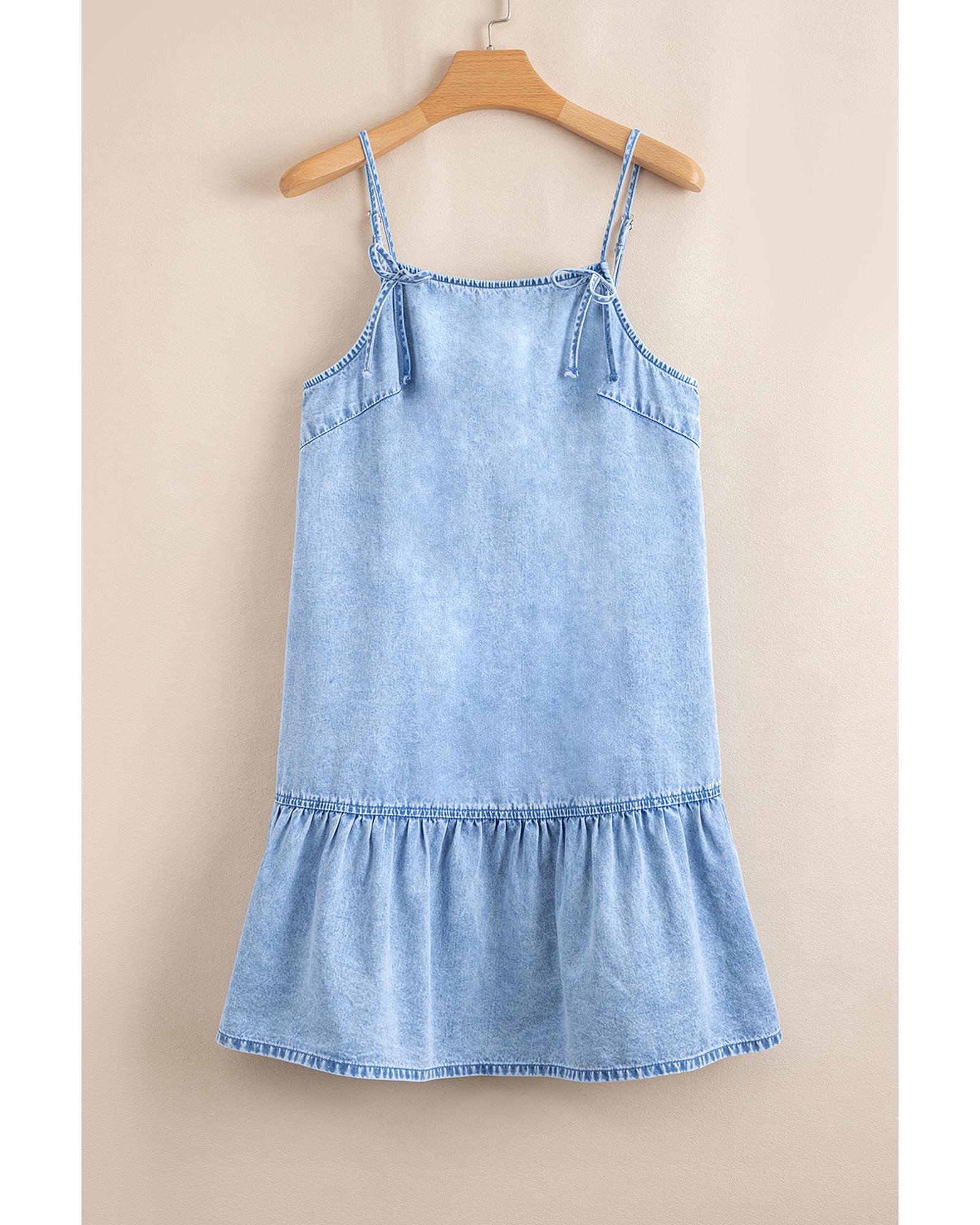 • Beau Blue Bow Detail Spaghetti Straps Ruffle Hem Denim Short Dress
