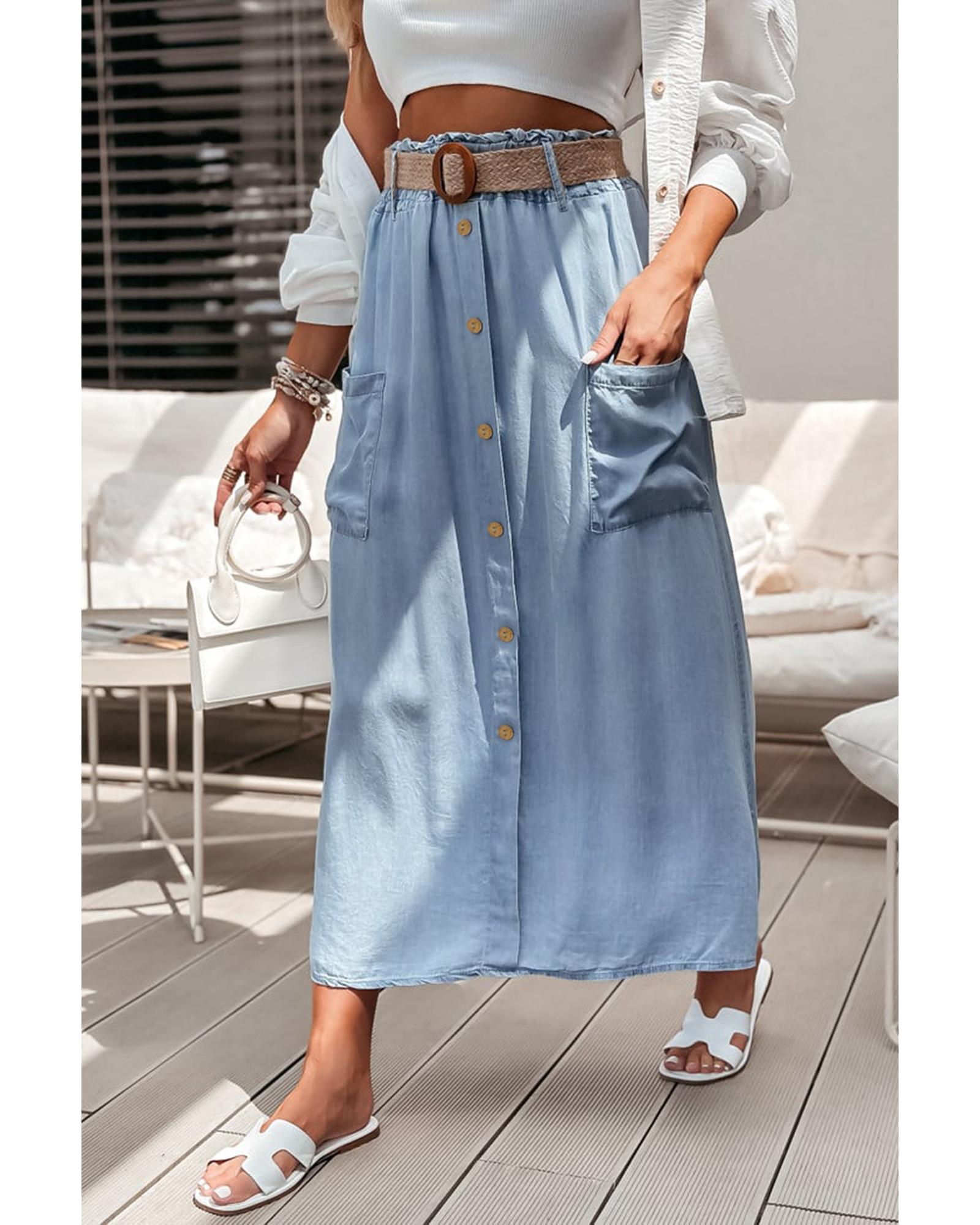 - Versatile denim maxi skirt with a buttoned front for easy wear