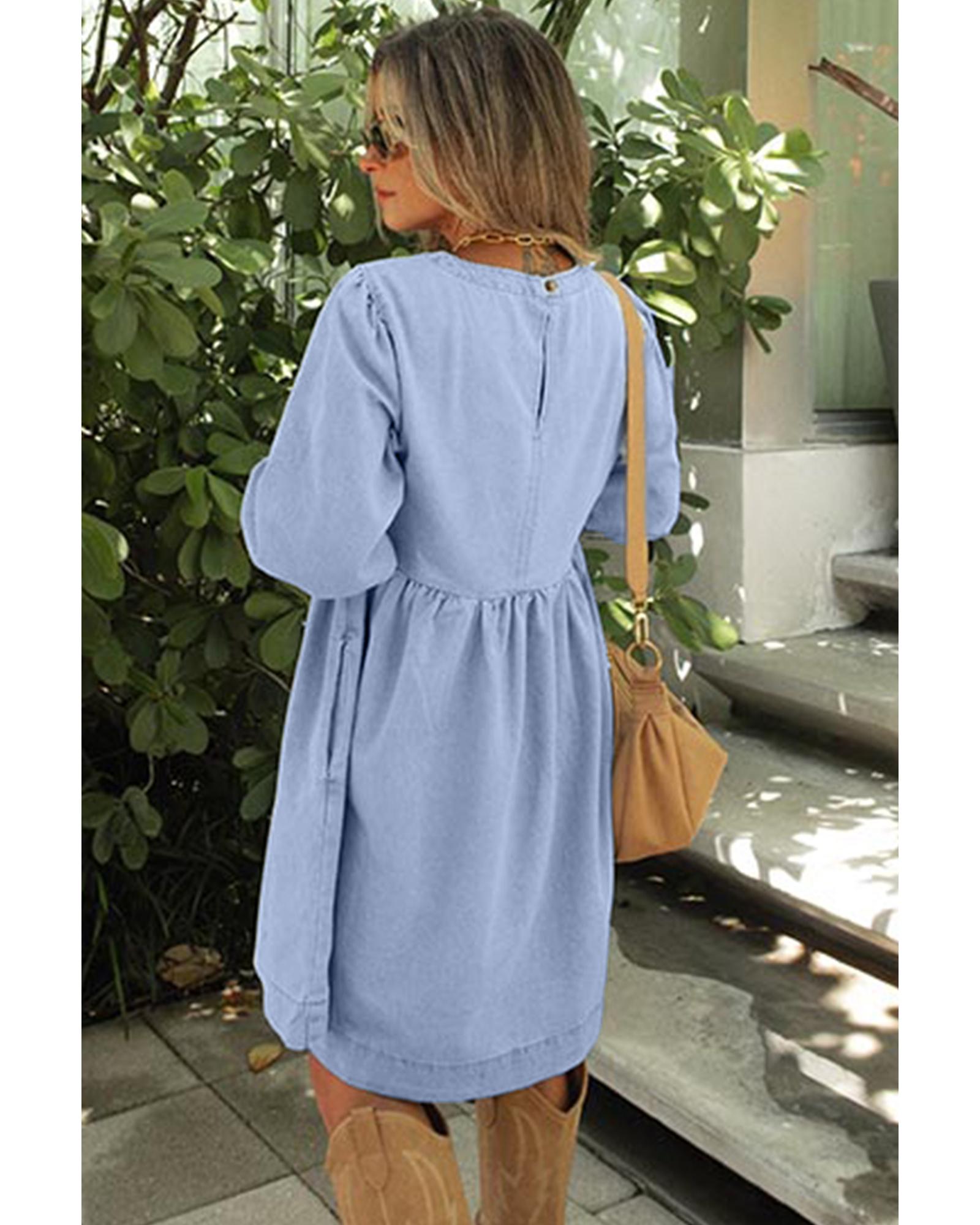Beau Blue Denim Button Detail Babydoll Square Neck Mini Dress – L