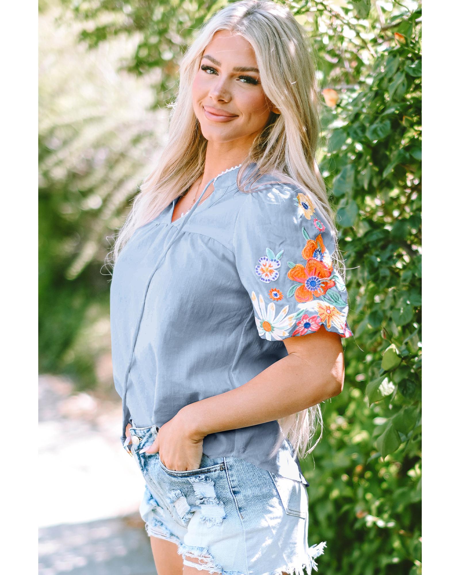 Beau Blue Floral Embroidered Puff Sleeve Split Neck Blouse – M