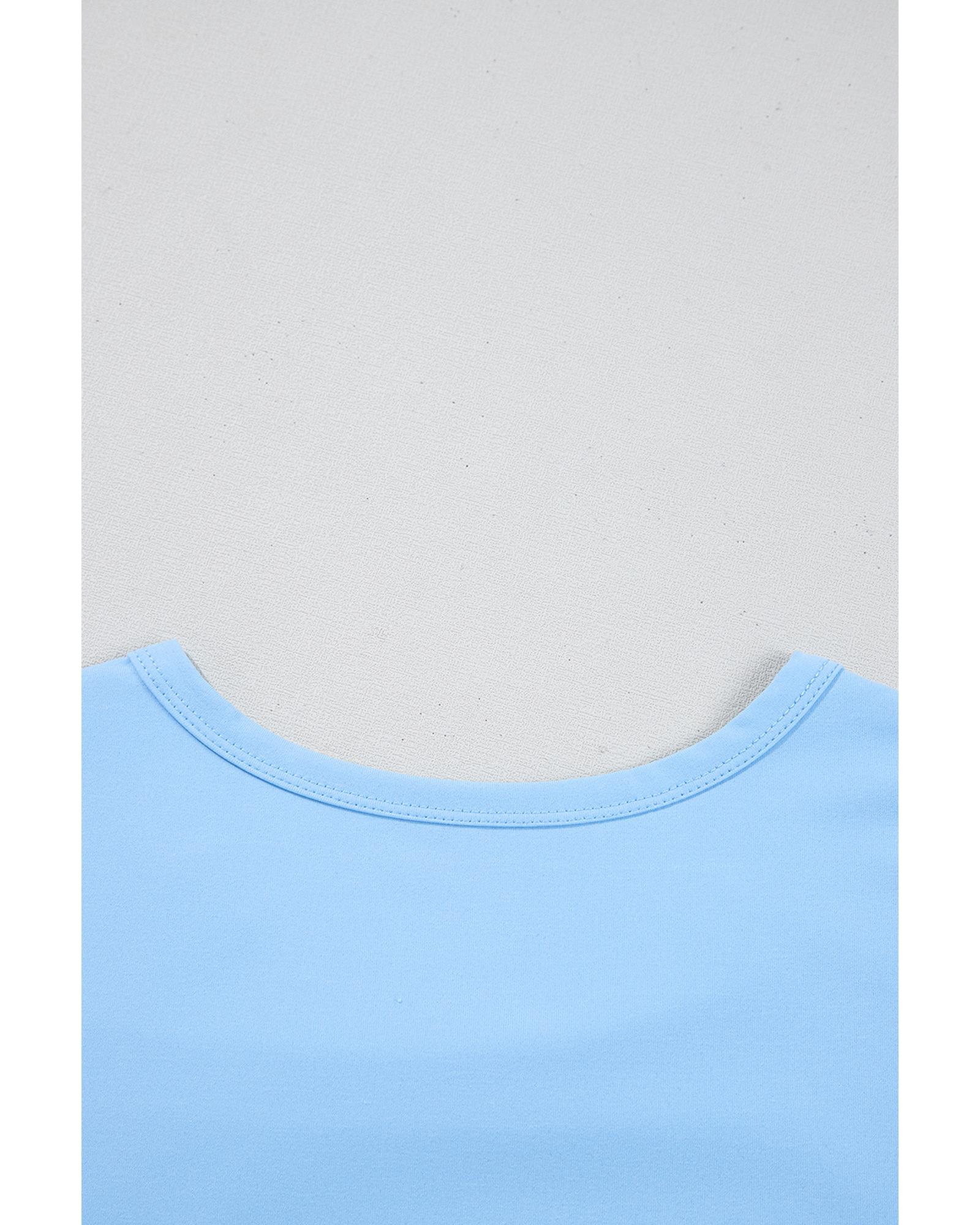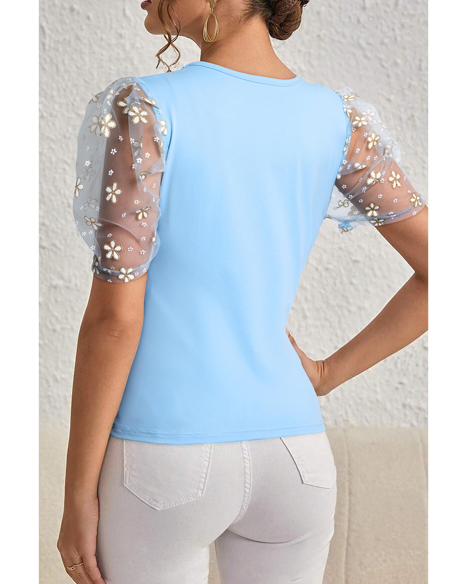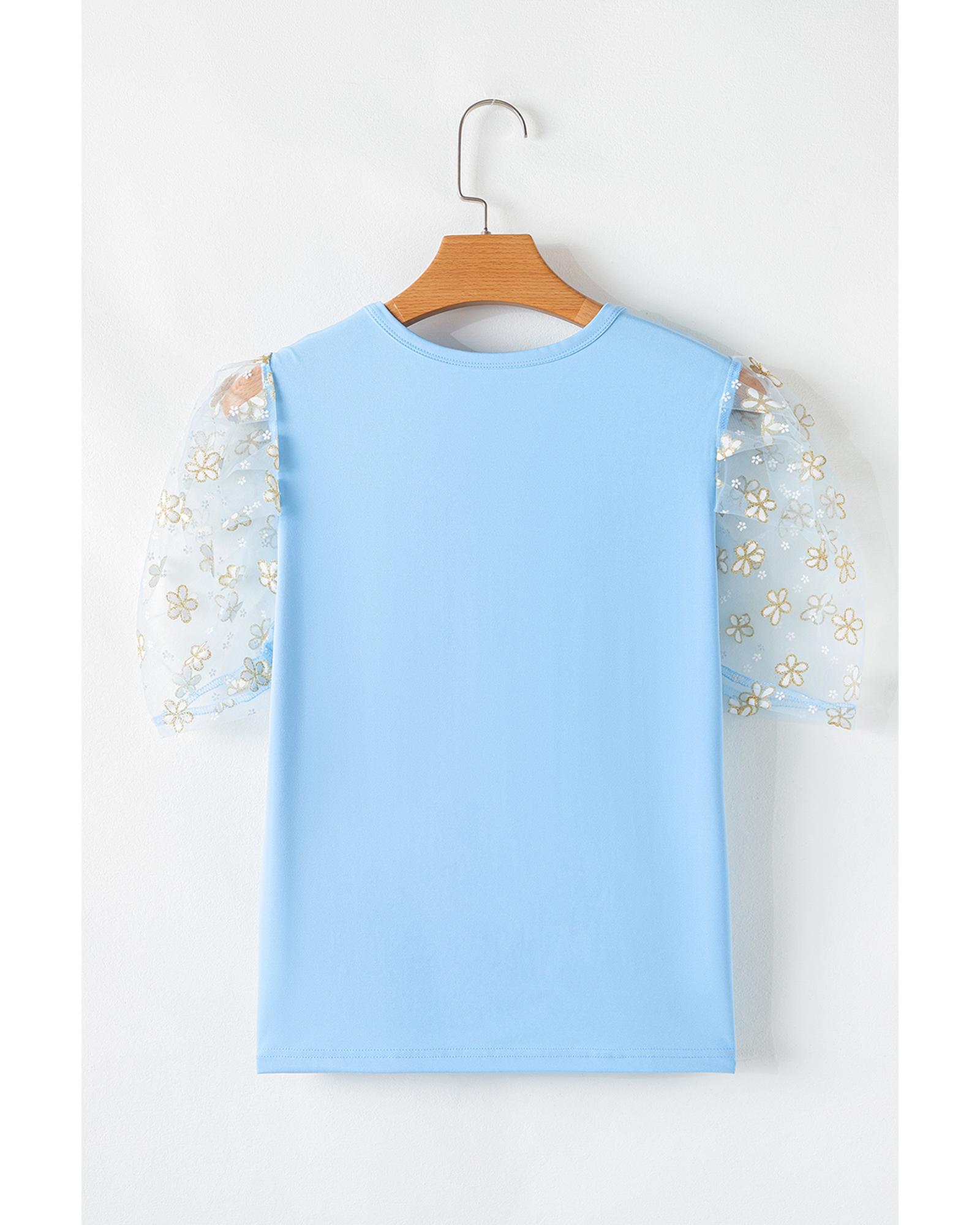 Beau Blue Floral Mesh Puff Sleeve Crew Neck Top – M