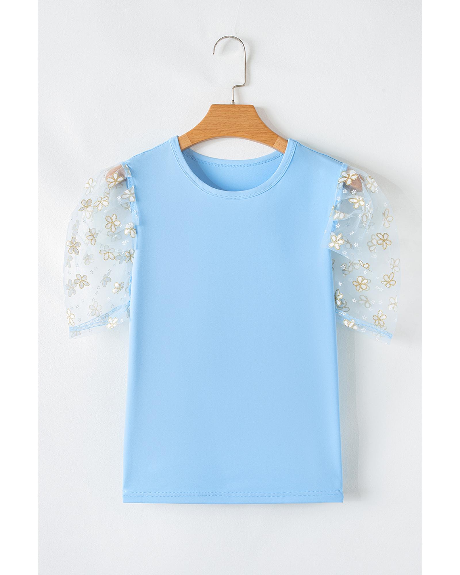 Beau Blue Floral Mesh Puff Sleeve Crew Neck Top – XL