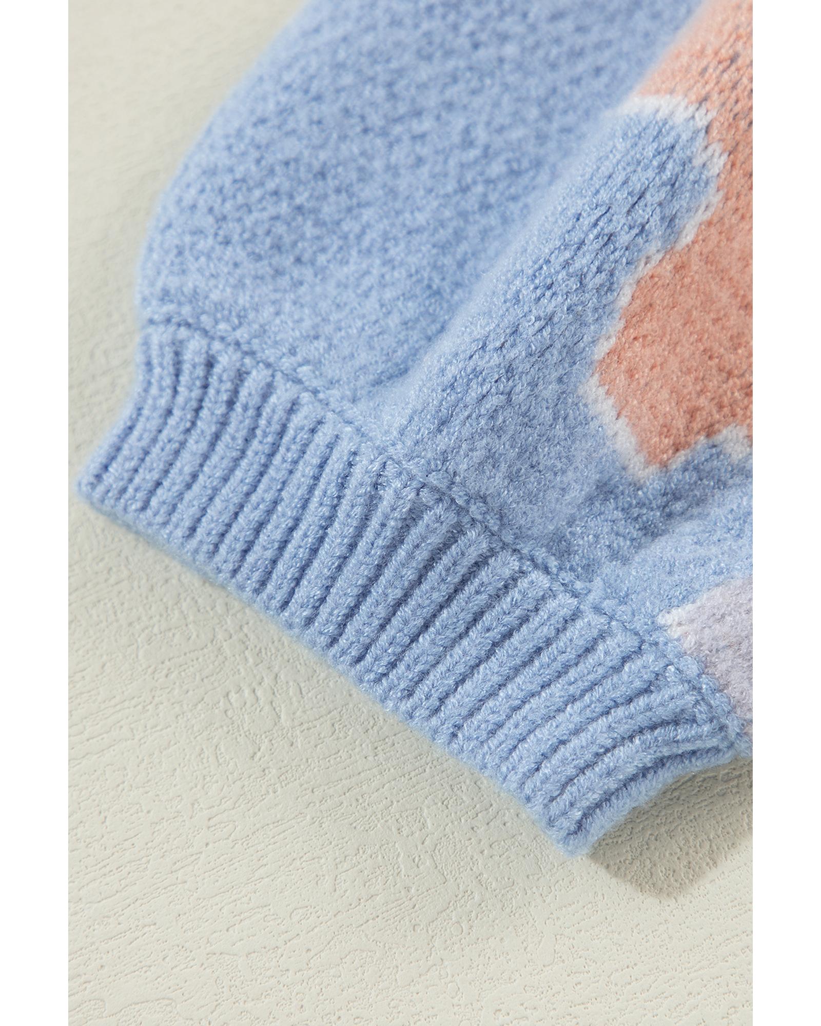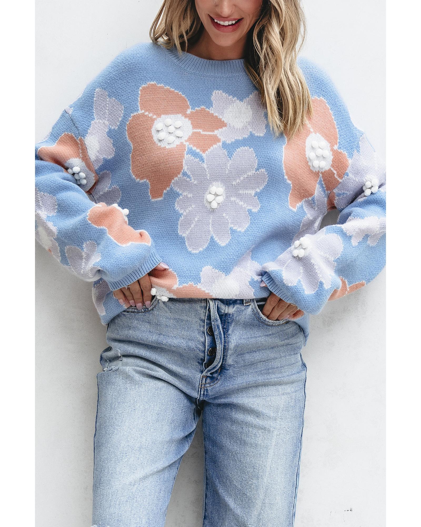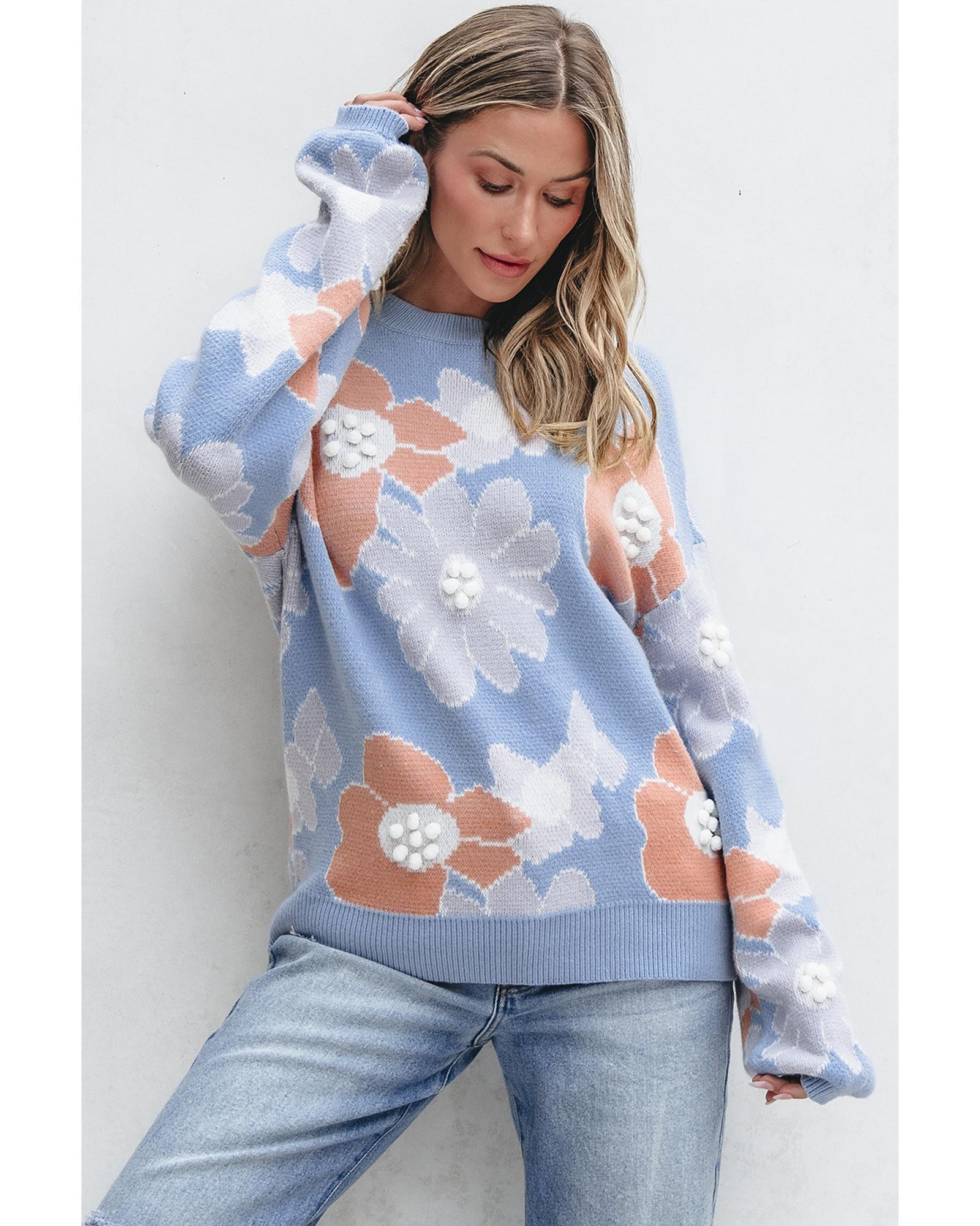 Beau Blue Floral O Neck Drop Shoulder Knitted Sweater – M