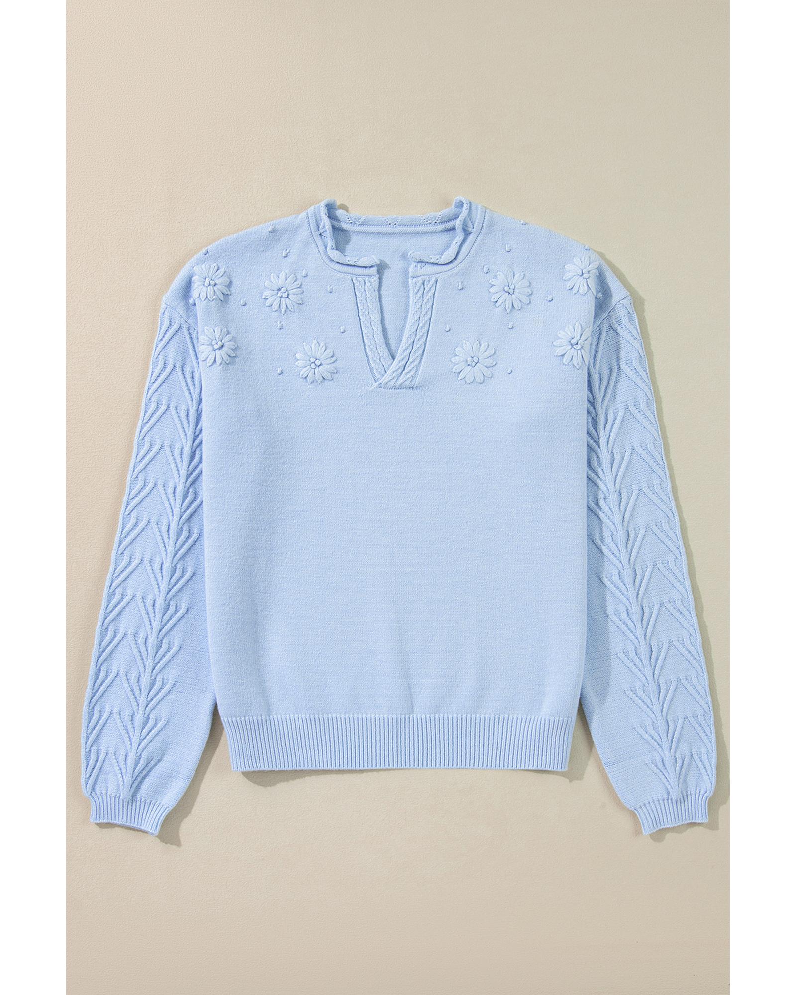 Beau Blue Flower Detail Knitted Notched Neck Sweater – XL
