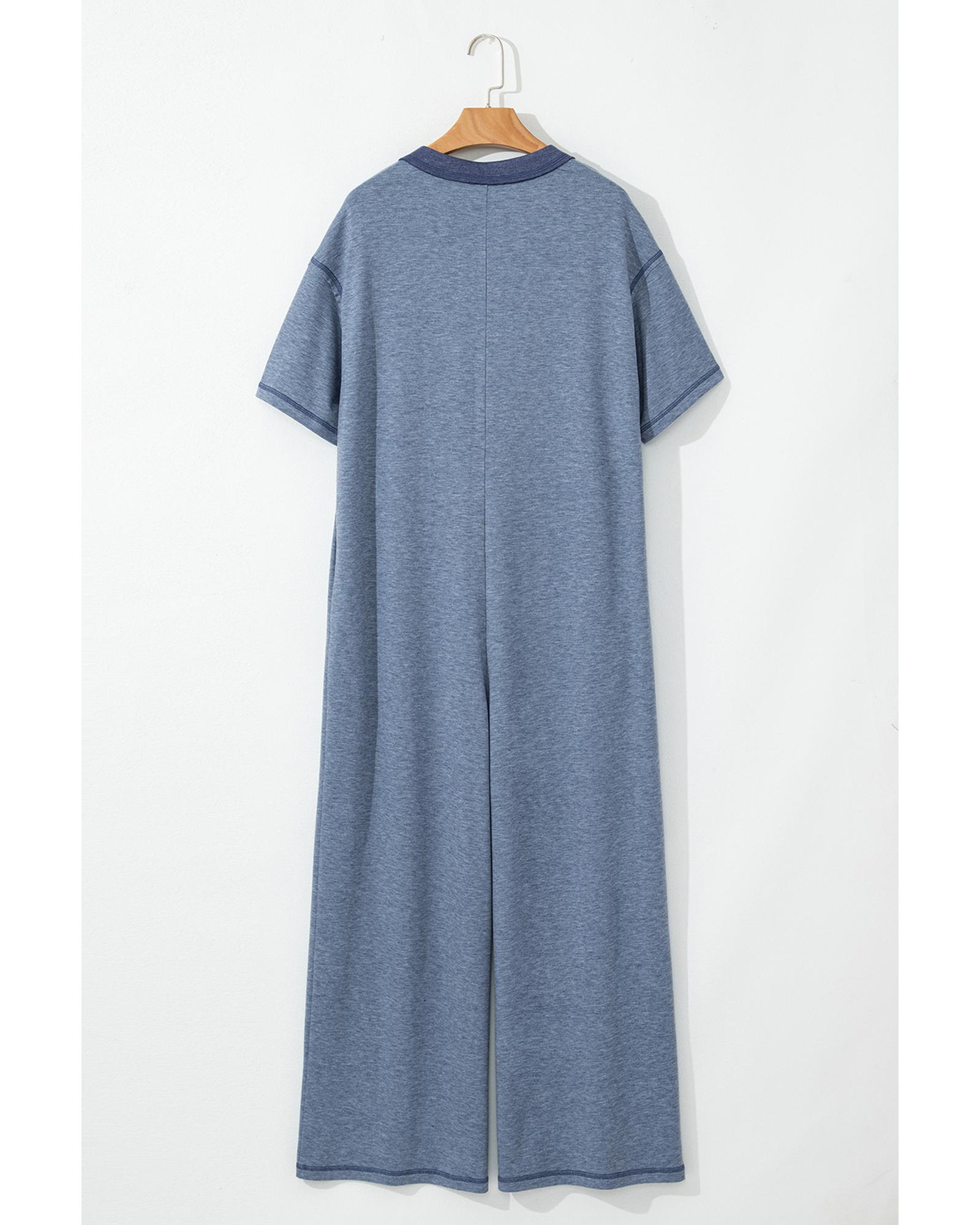 Beau Blue Half Placket Chest Pockets Short Sleeve Wide Leg Jumpsuit - M