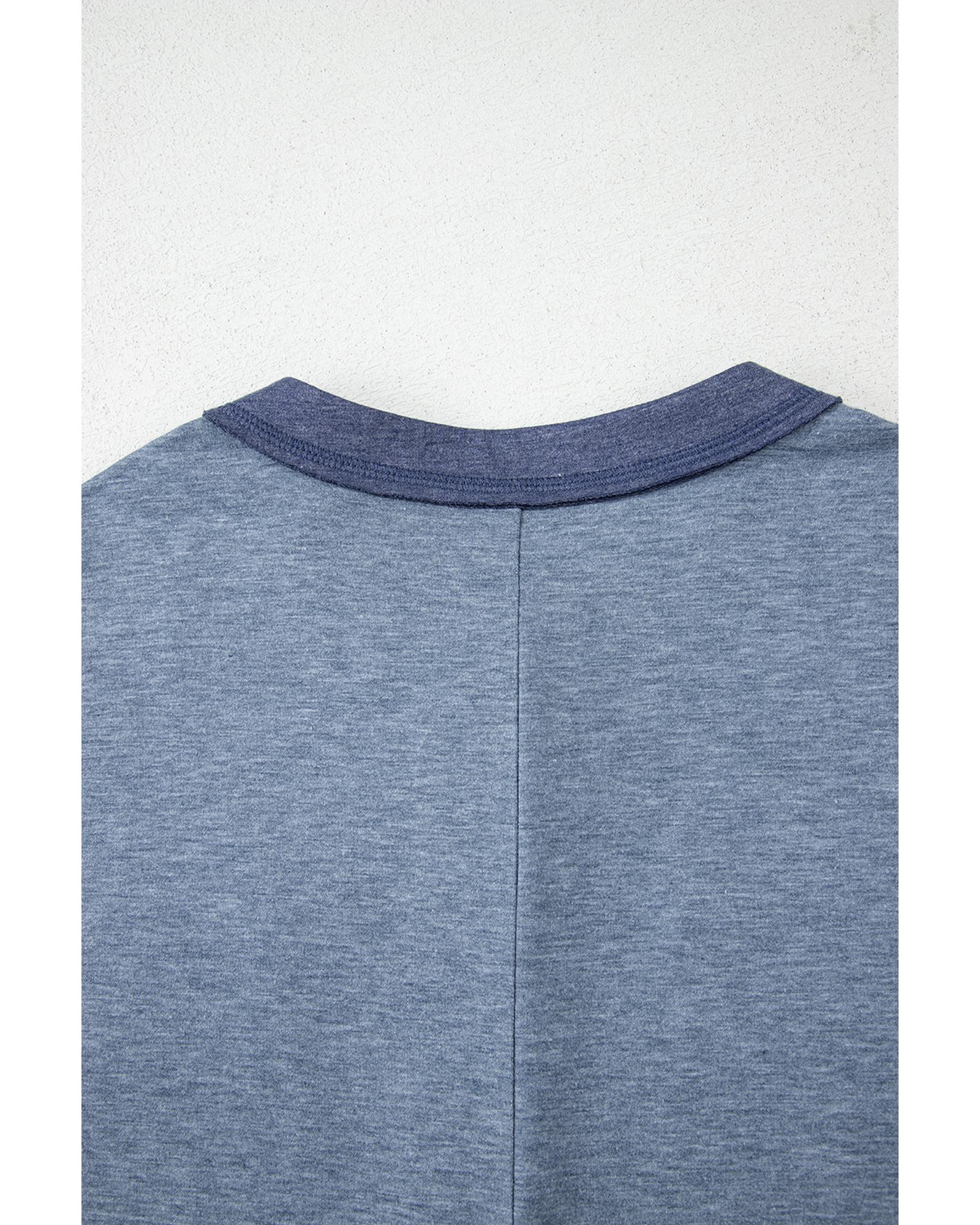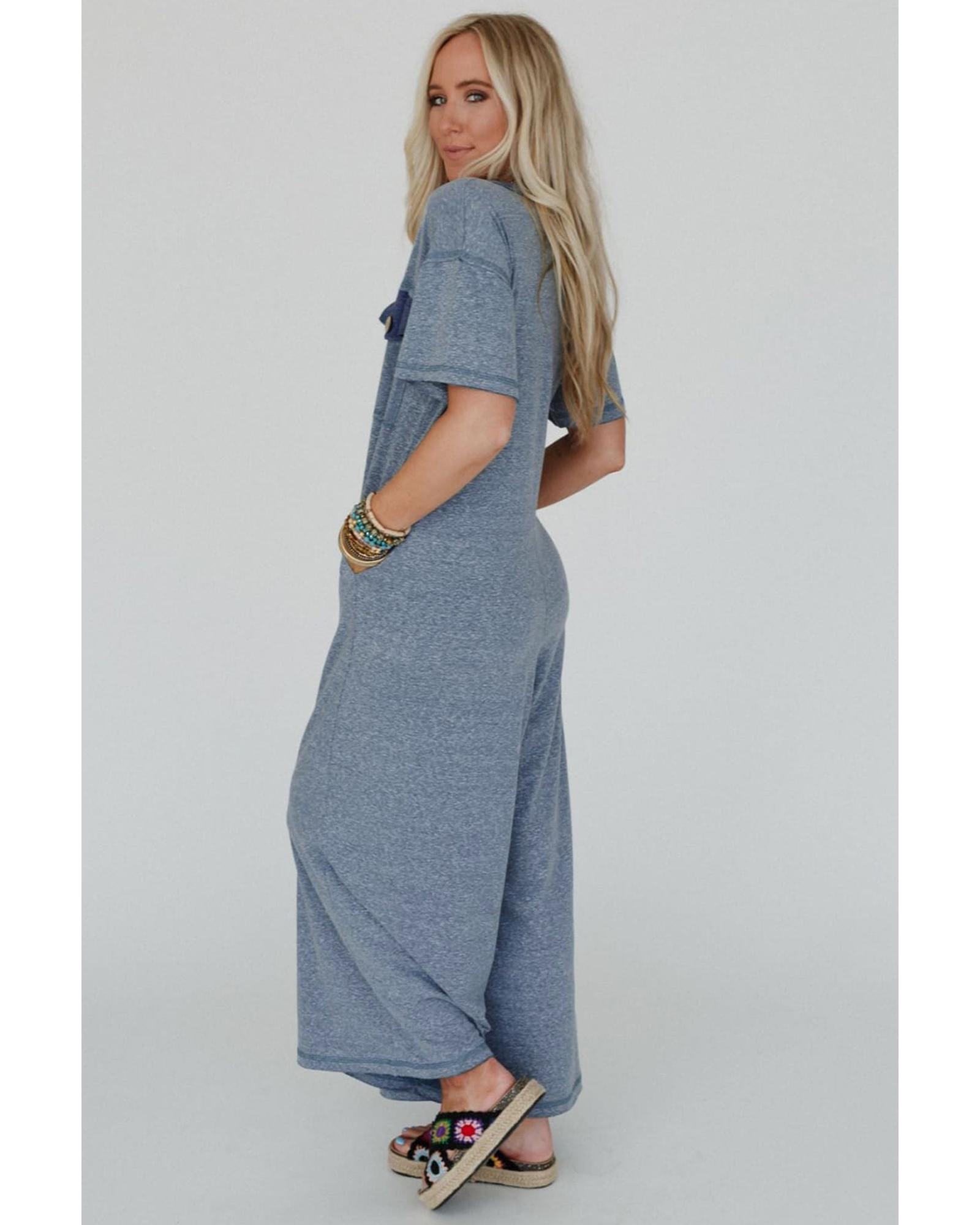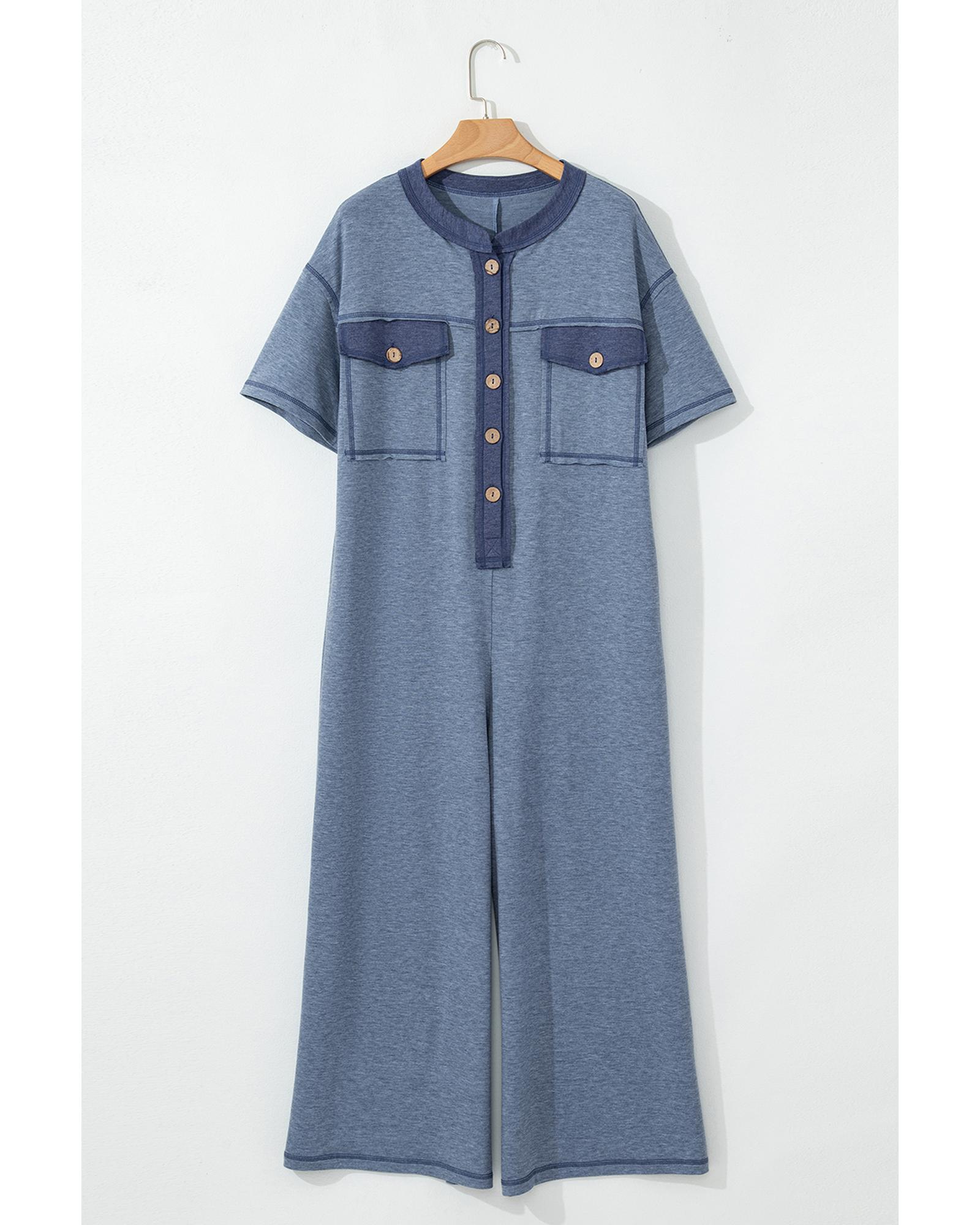 Beau Blue Half Placket Chest Pockets Short Sleeve Wide Leg Jumpsuit – M