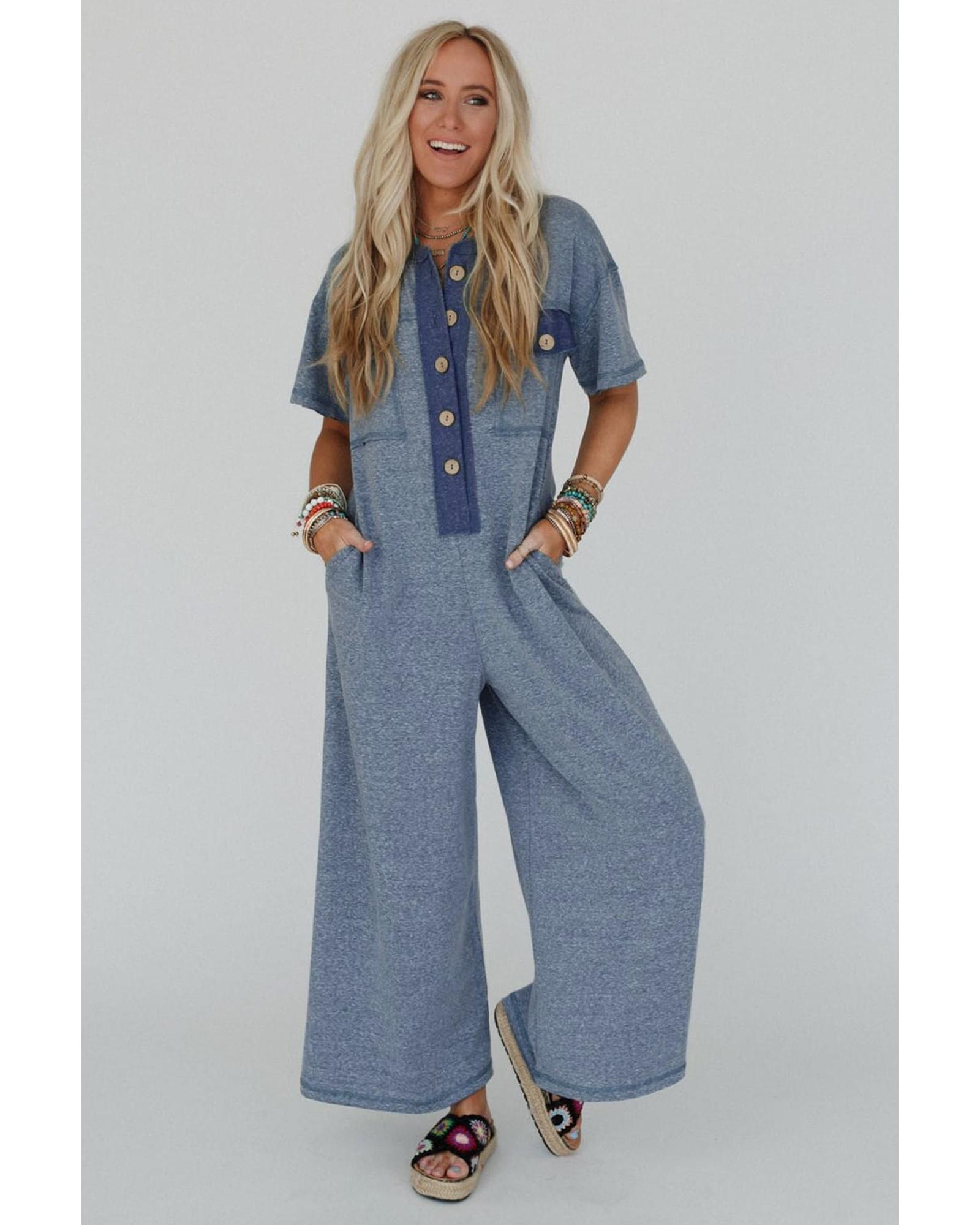 Beau Blue Half Placket Chest Pockets Short Sleeve Wide Leg Jumpsuit - L
