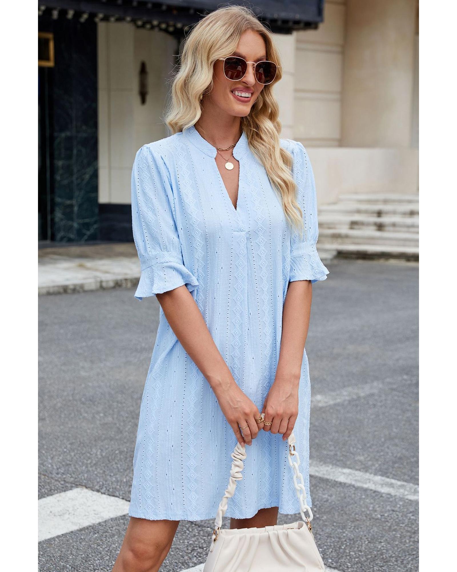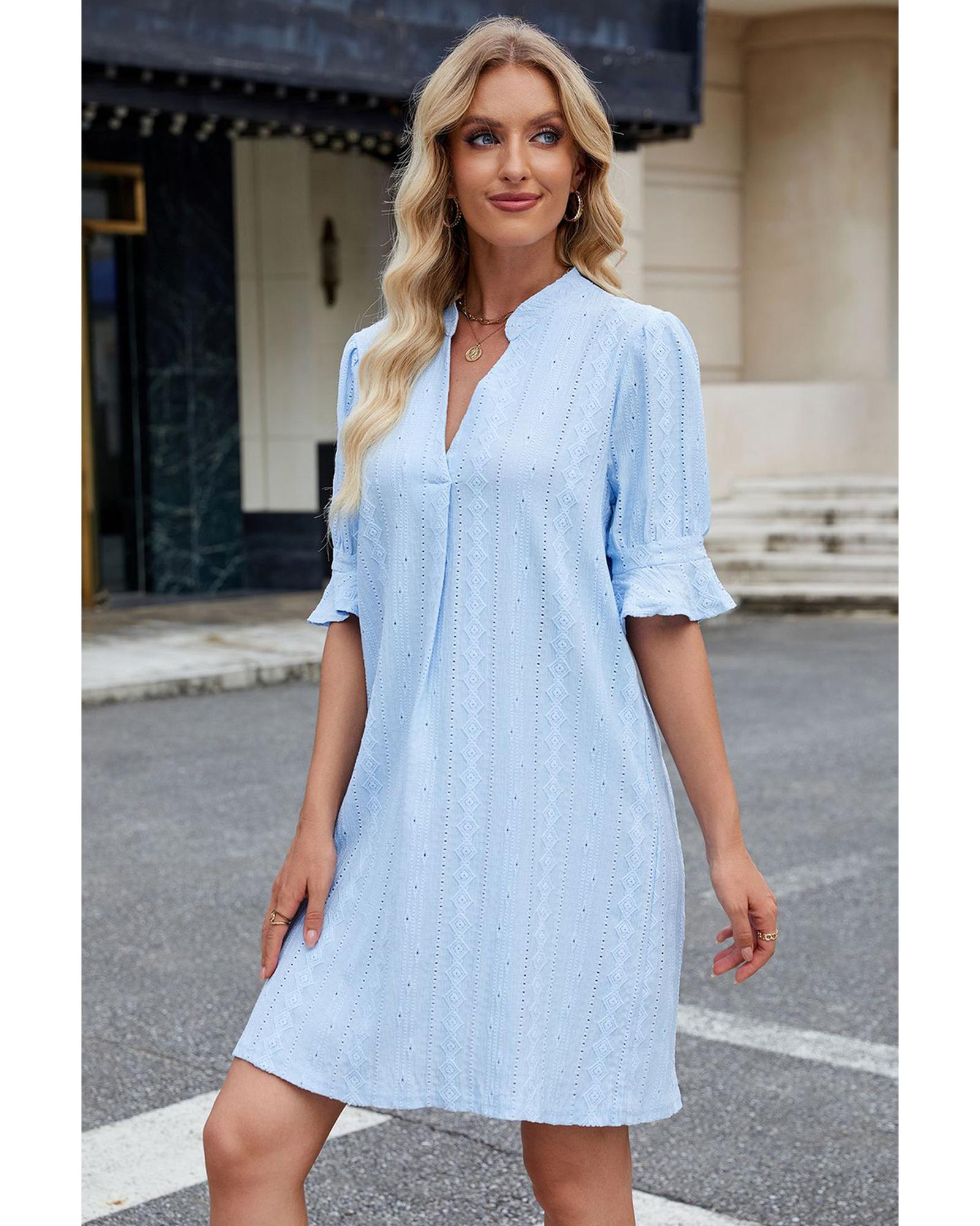 Beau Blue Jacquard Texture Flared Short Sleeve Notched Neck Mini Dress – M