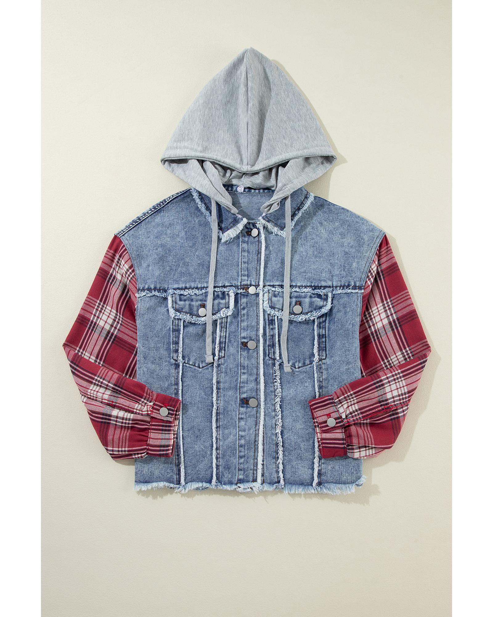 Beau Blue Plaid Print Patchwork Hooded Raw Hem Denim Jacket – S