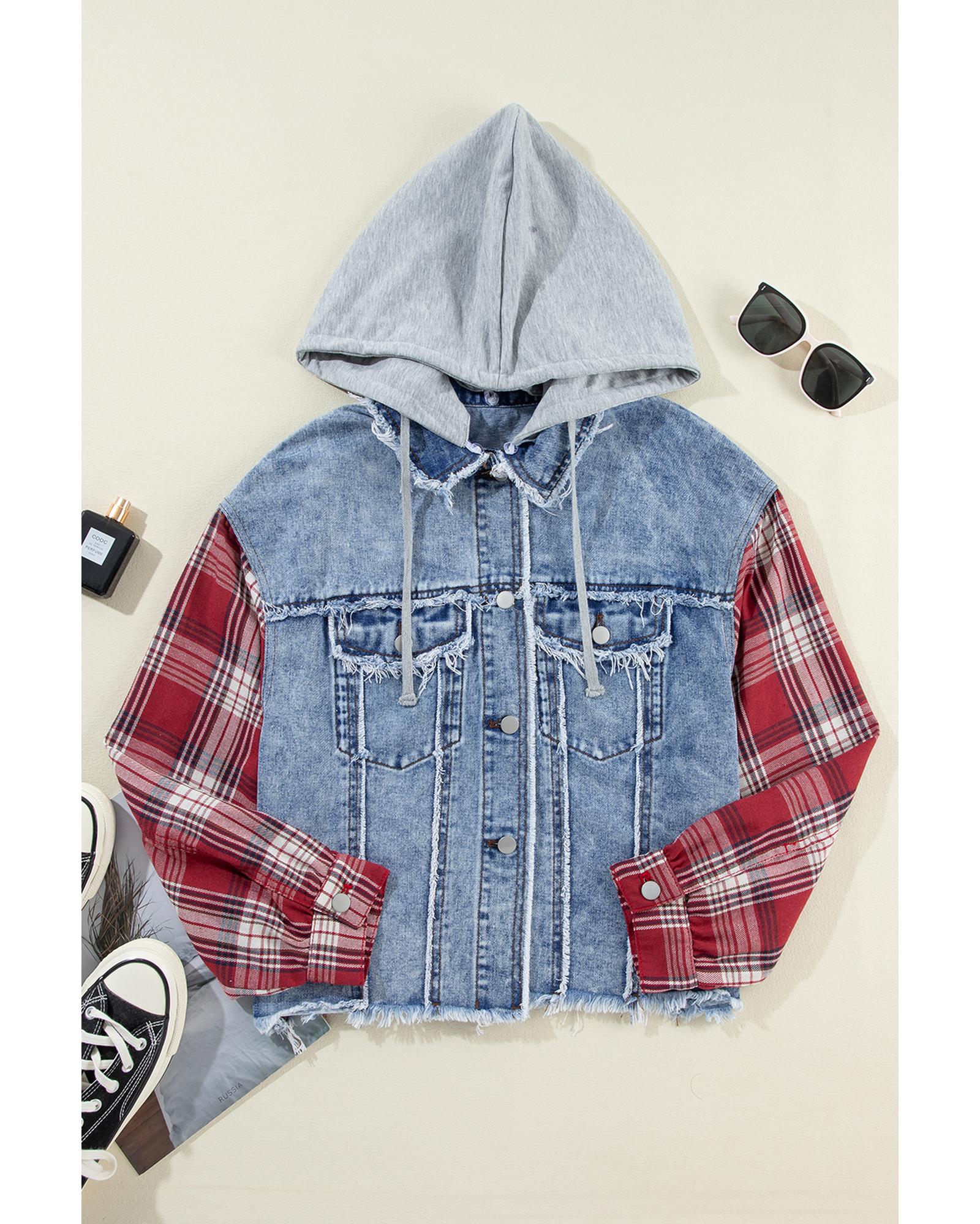 Beau Blue Plaid Print Patchwork Hooded Raw Hem Denim Jacket - S