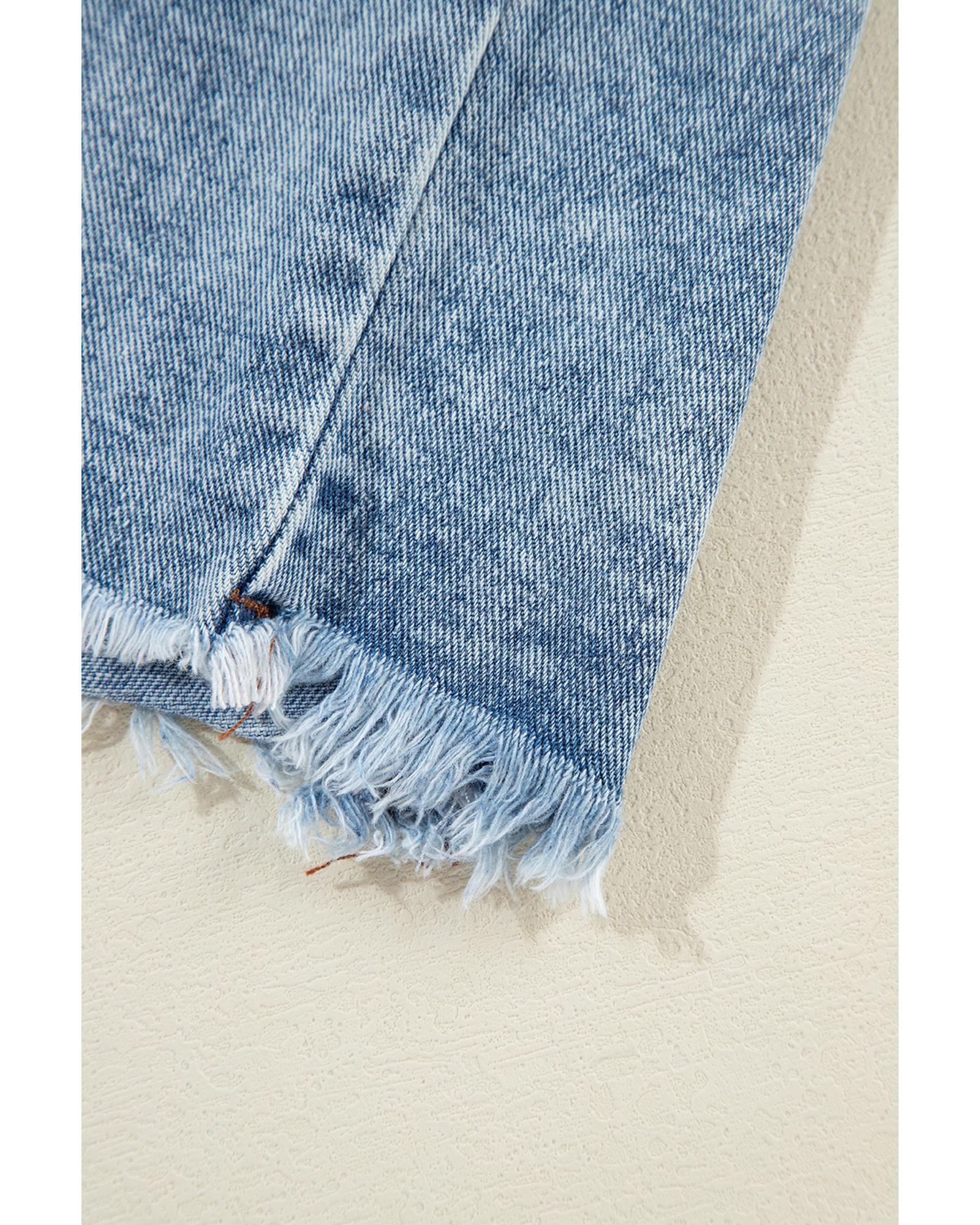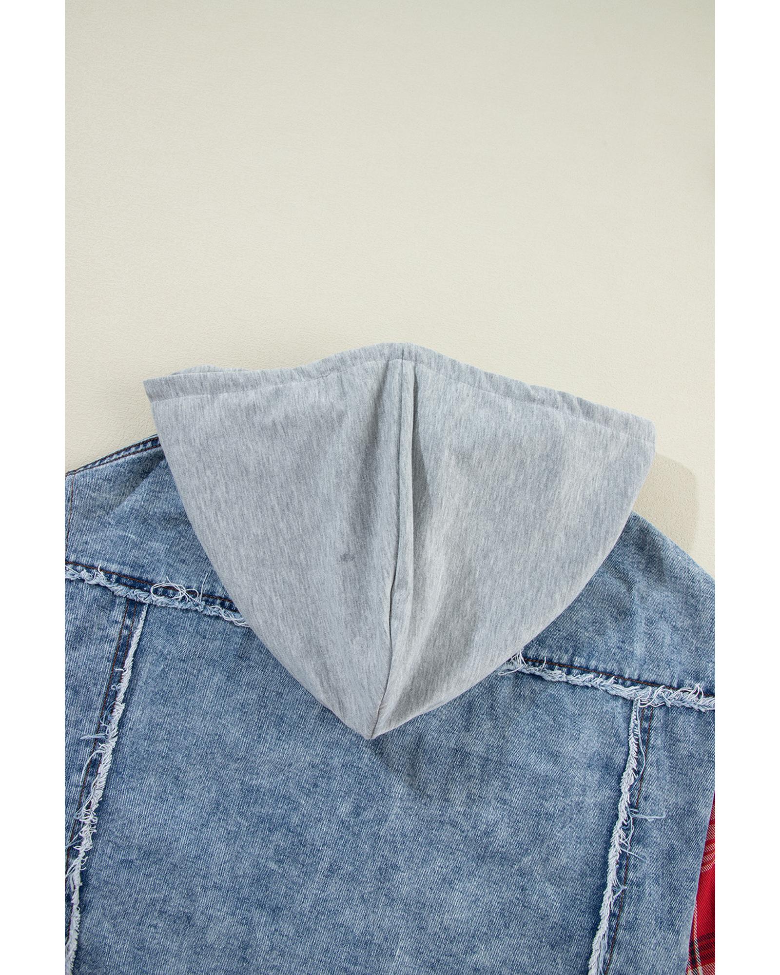 Beau Blue Plaid Print Patchwork Hooded Raw Hem Denim Jacket – XL