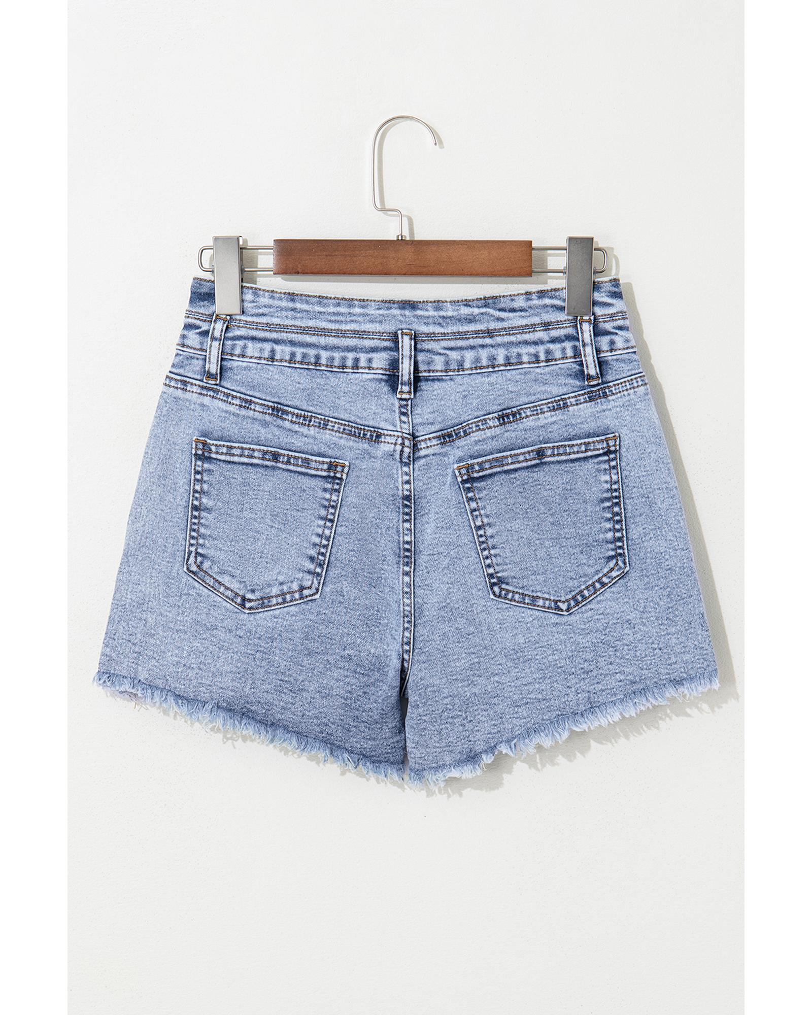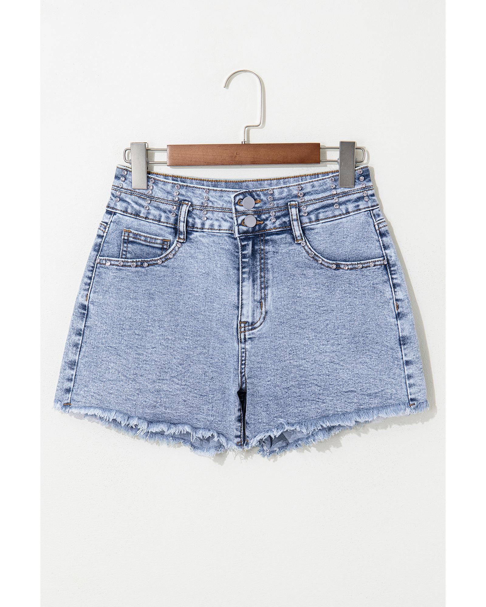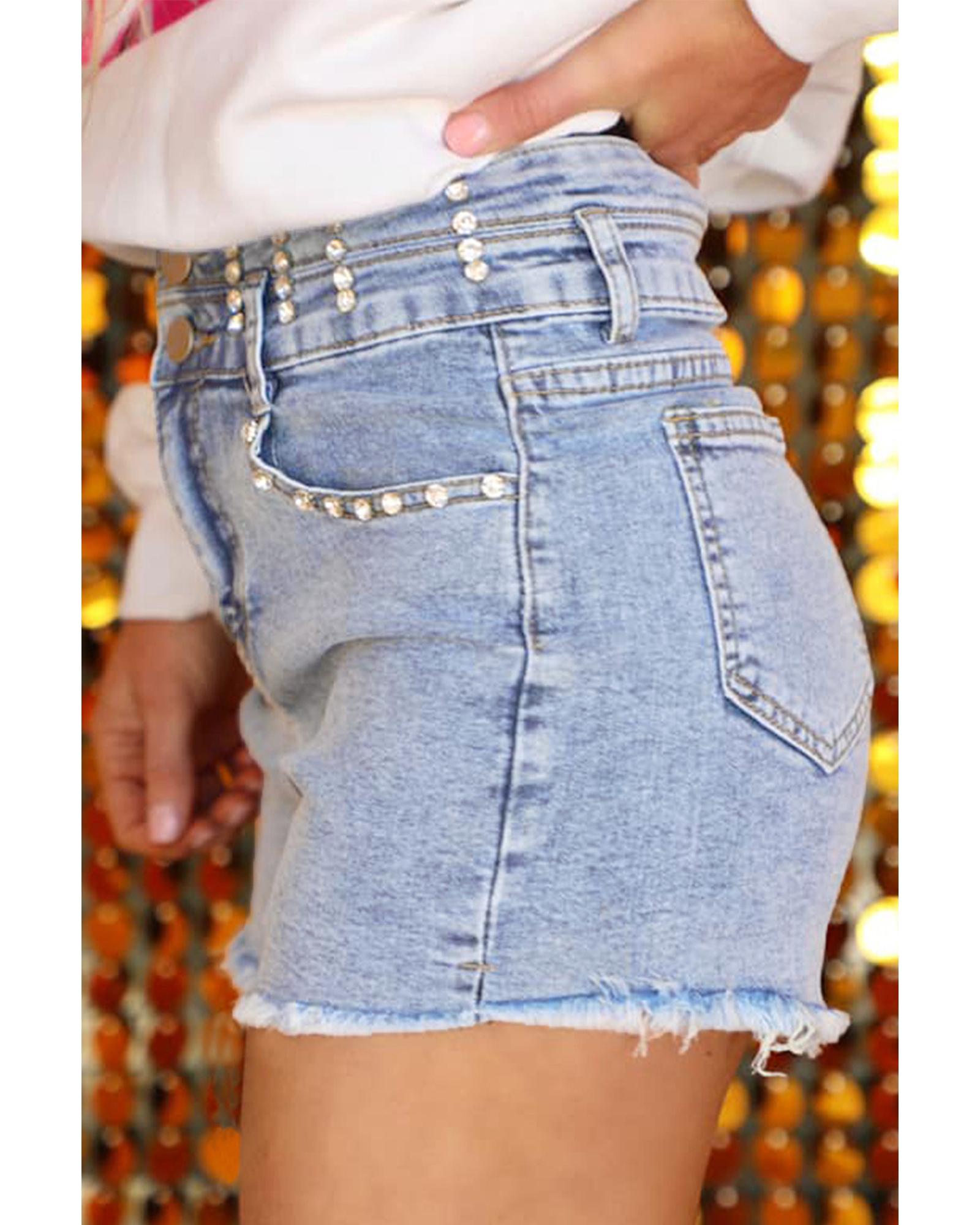 Beau Blue Rhinestone Light Wash Raw Hem High Waist Denim Shorts – 8 US