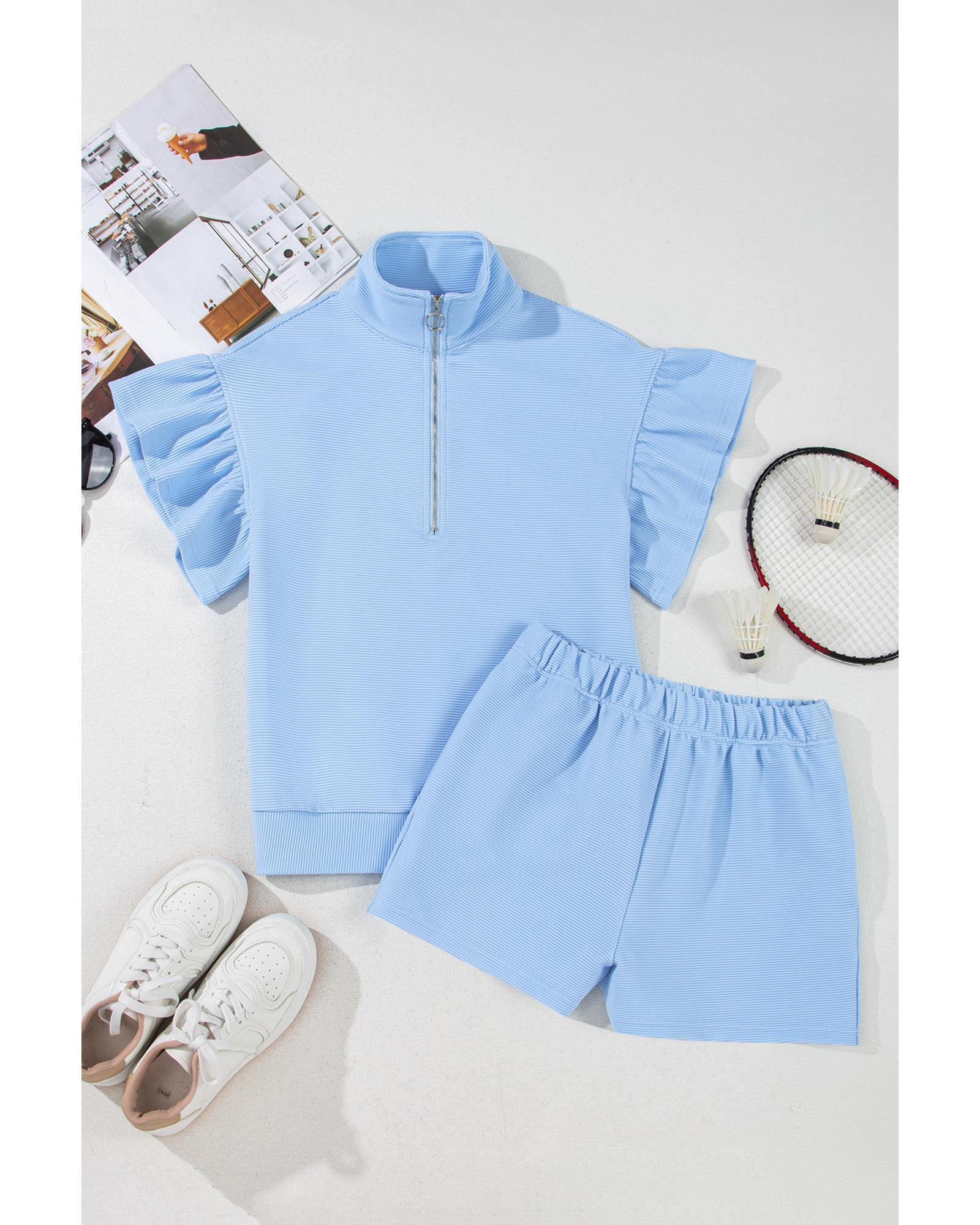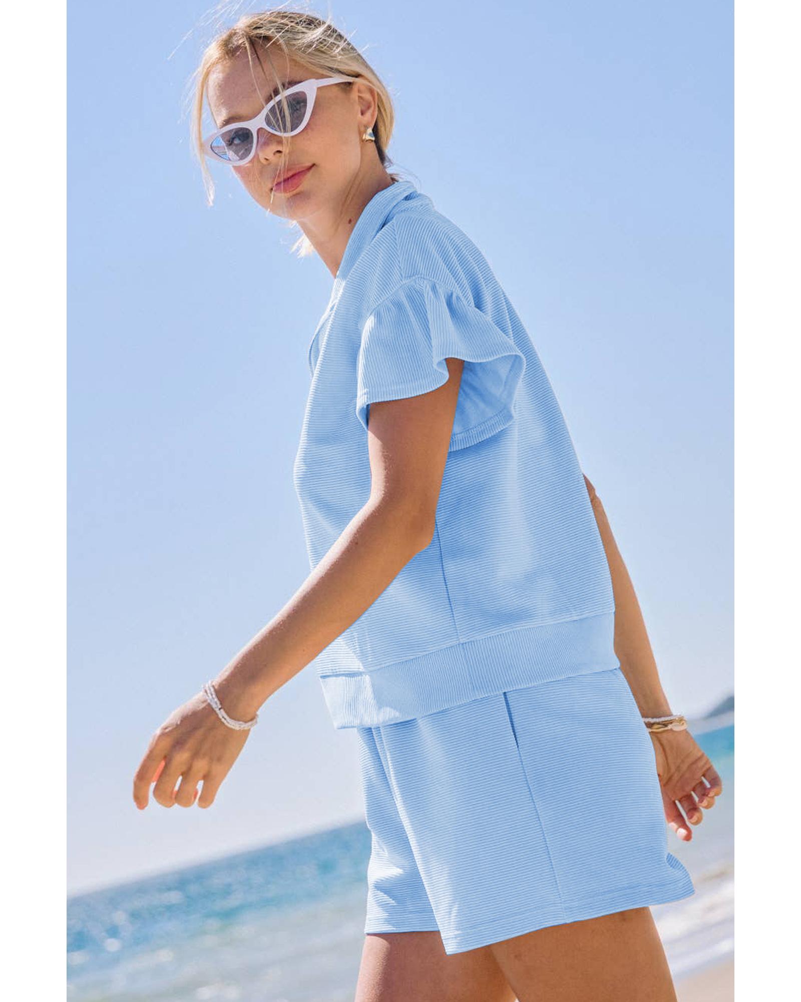 Beau Blue Ribbed Texture Half Zip Ruffled Short Sleeve Top and Shorts Set – M