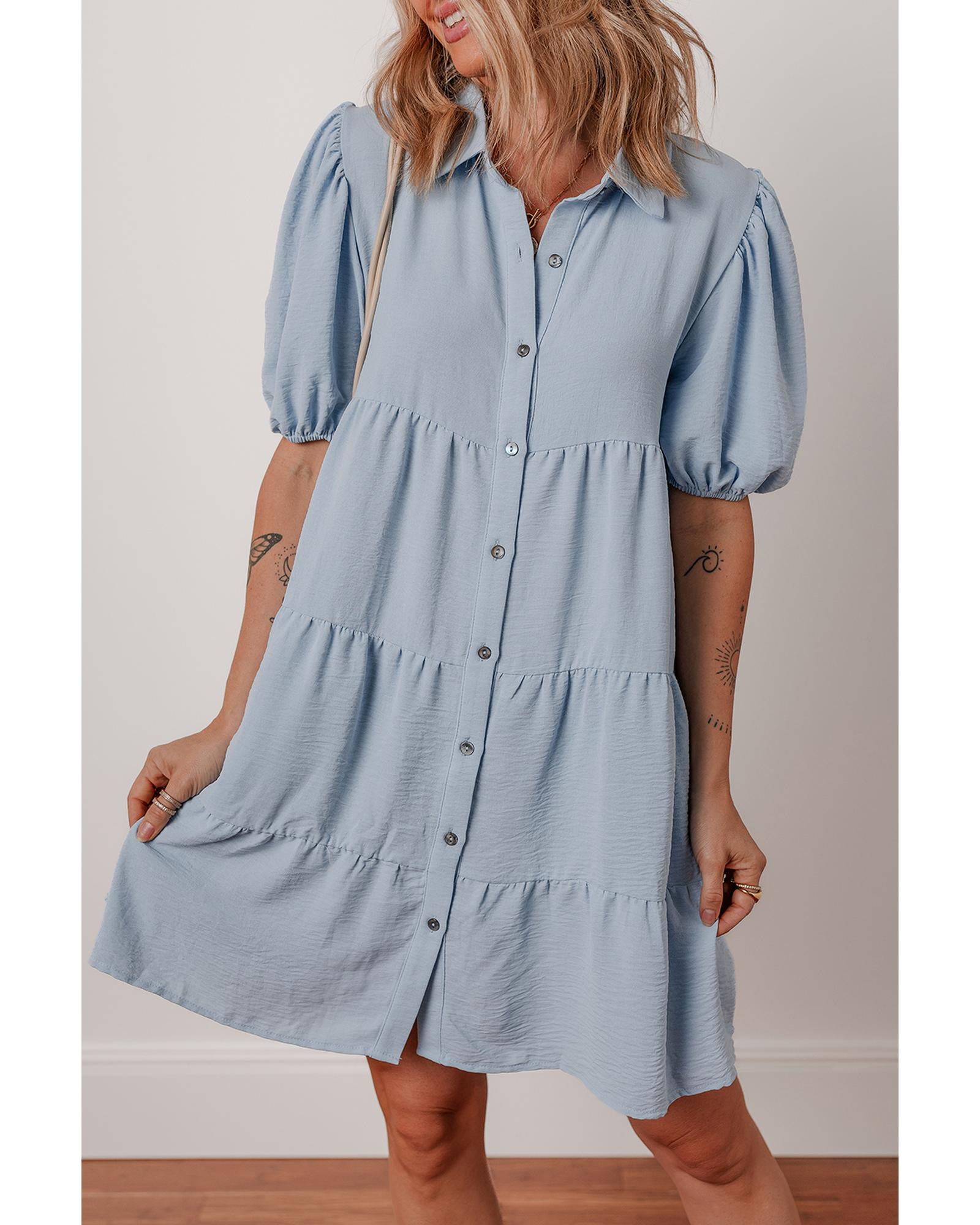 Beau Blue Shirt Collar Button Up Short Puff Sleeve Tiered Shift Dress – XL
