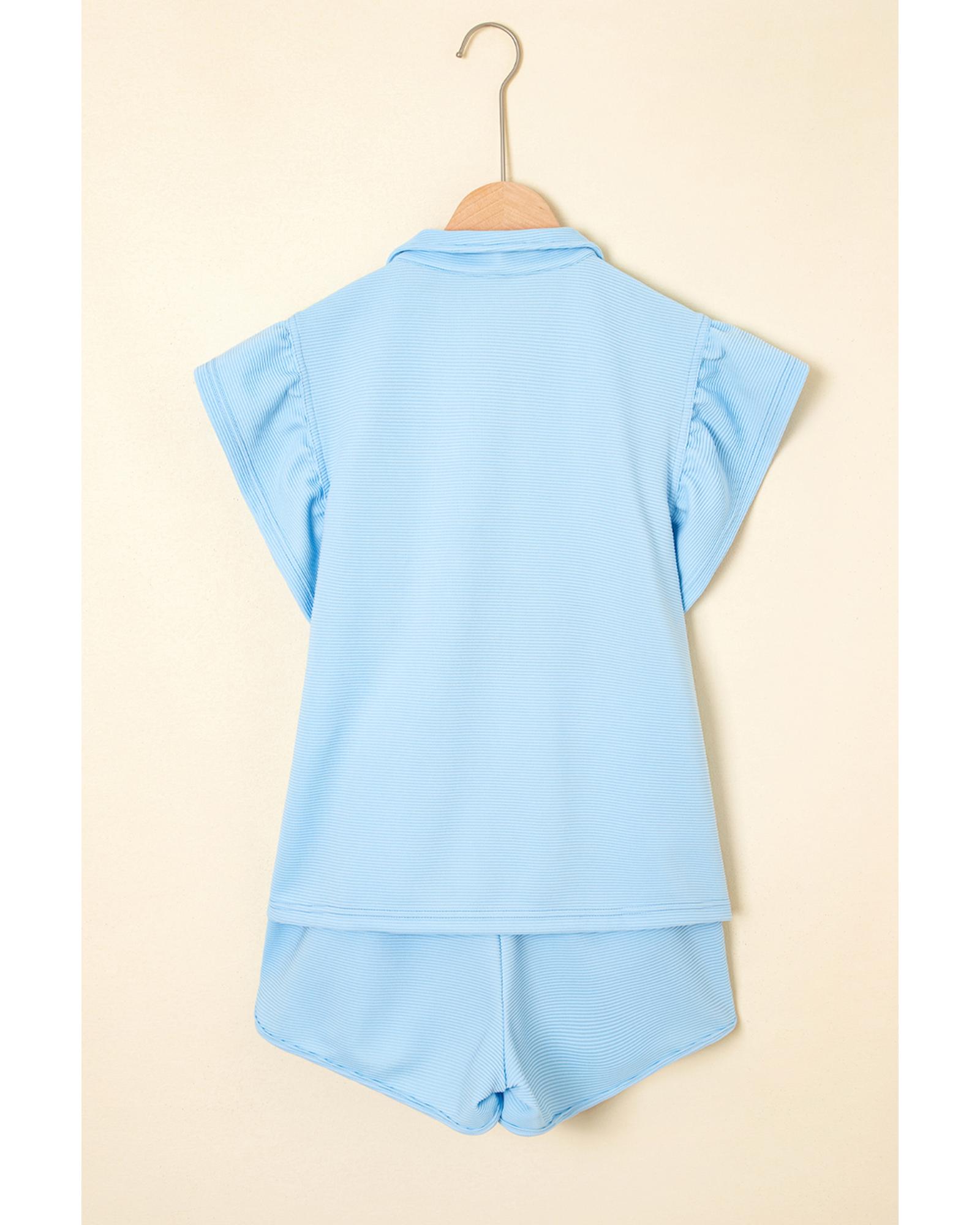Beau Blue Striped Detail Flutter Sleeve Zipped Collar Short Set – M