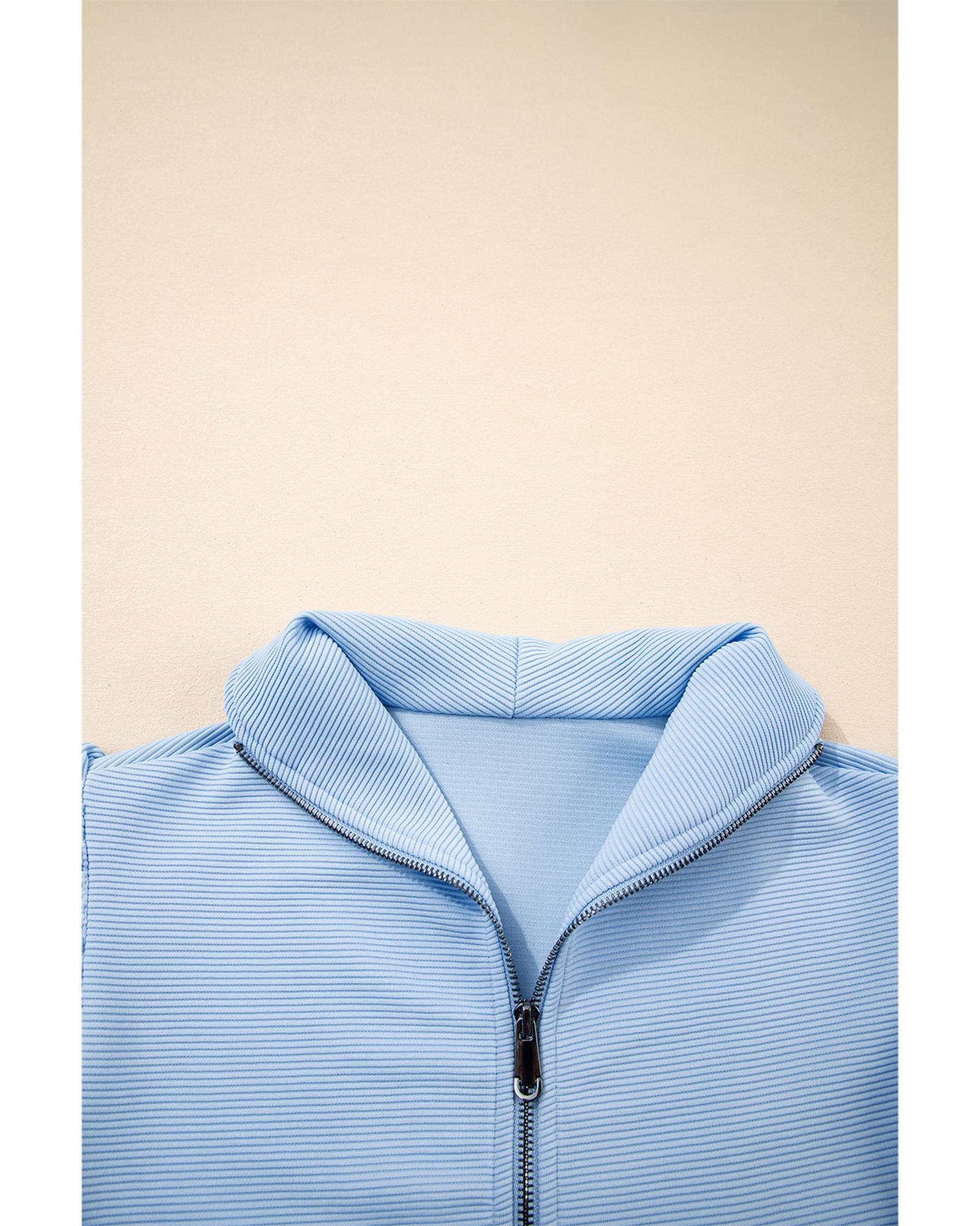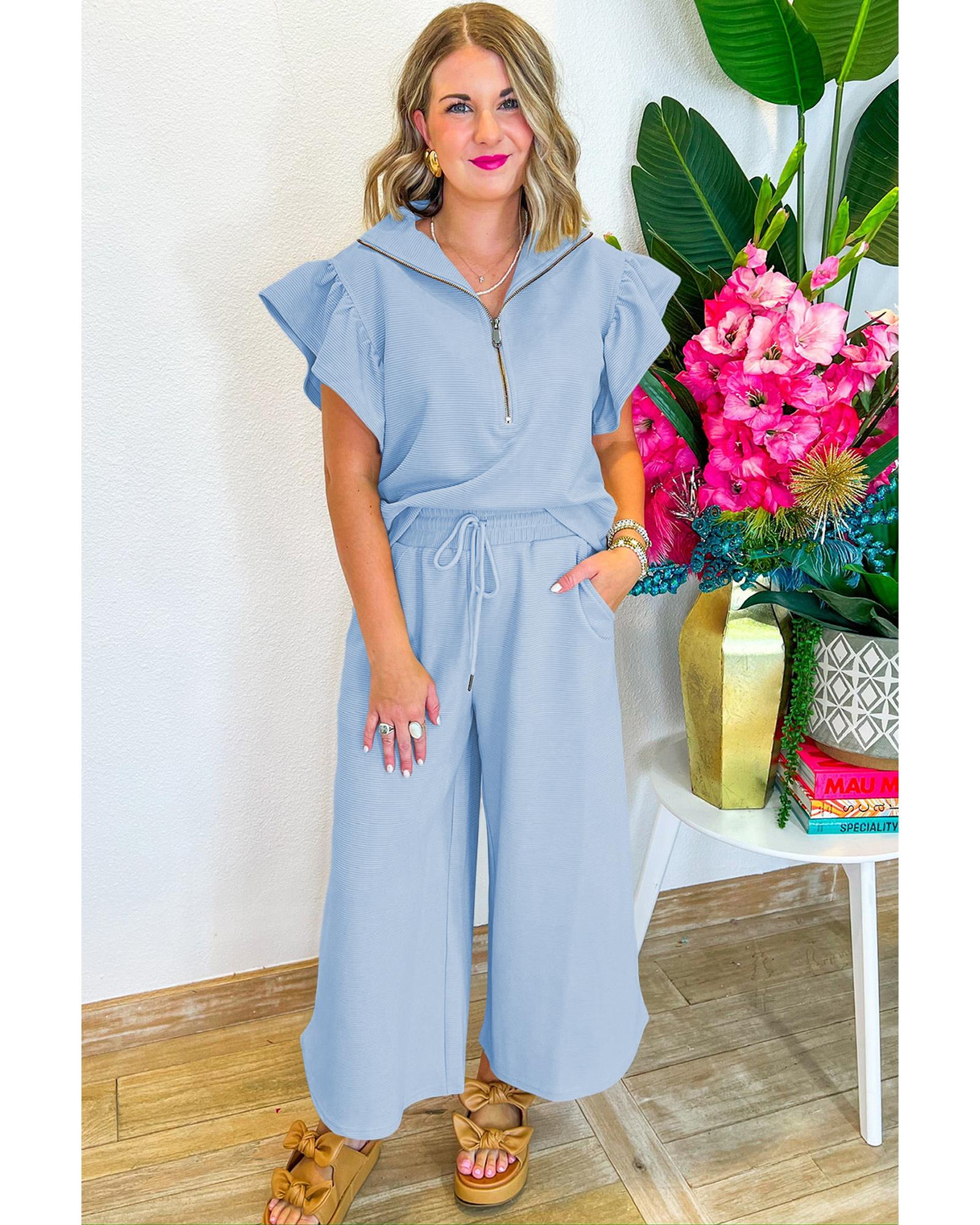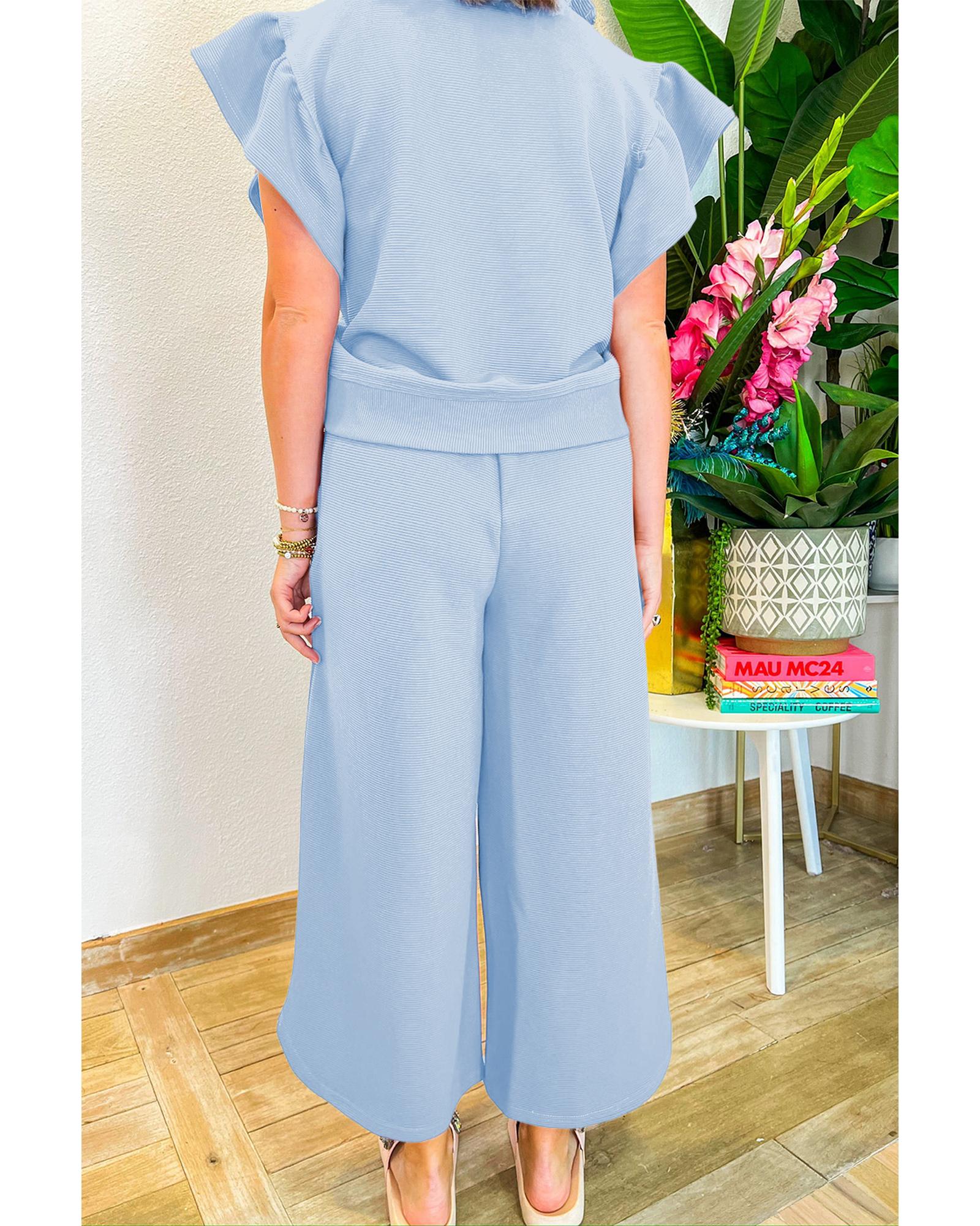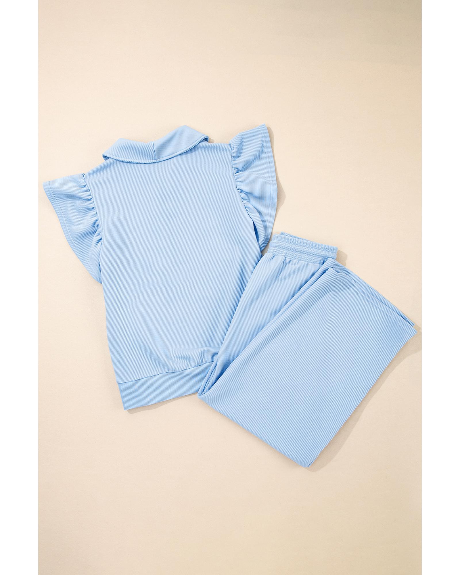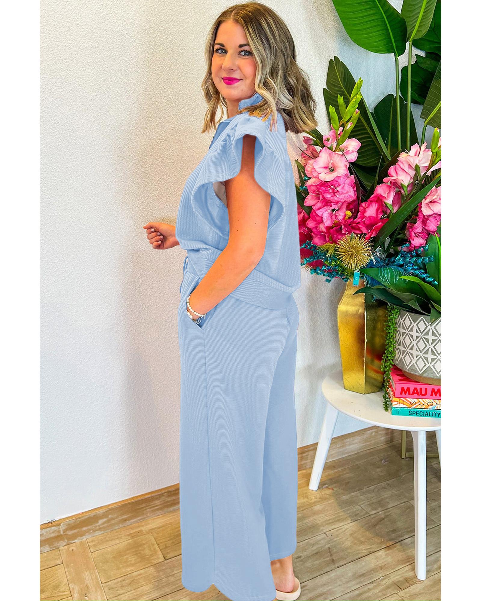 Beau Blue Textured Ruffled Sleeve Zipped Top and Wide Leg Pants Set - S
