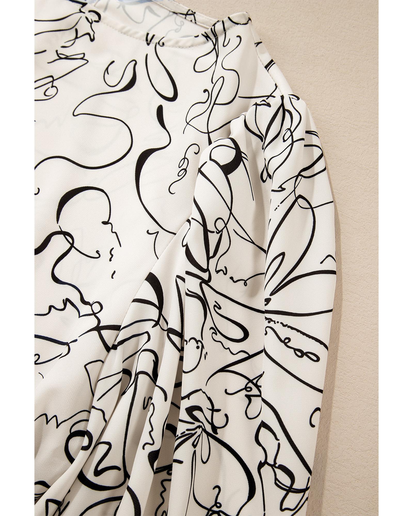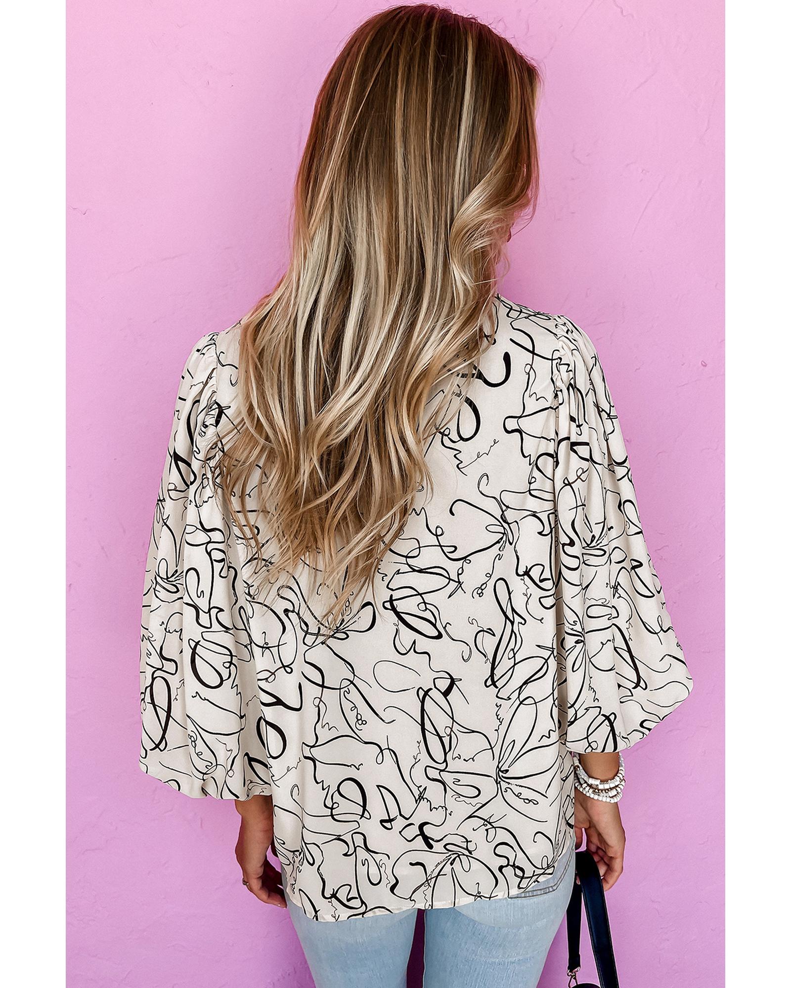 Beige Abstract Print Balloon Sleeve Crew Neck Blouse – S