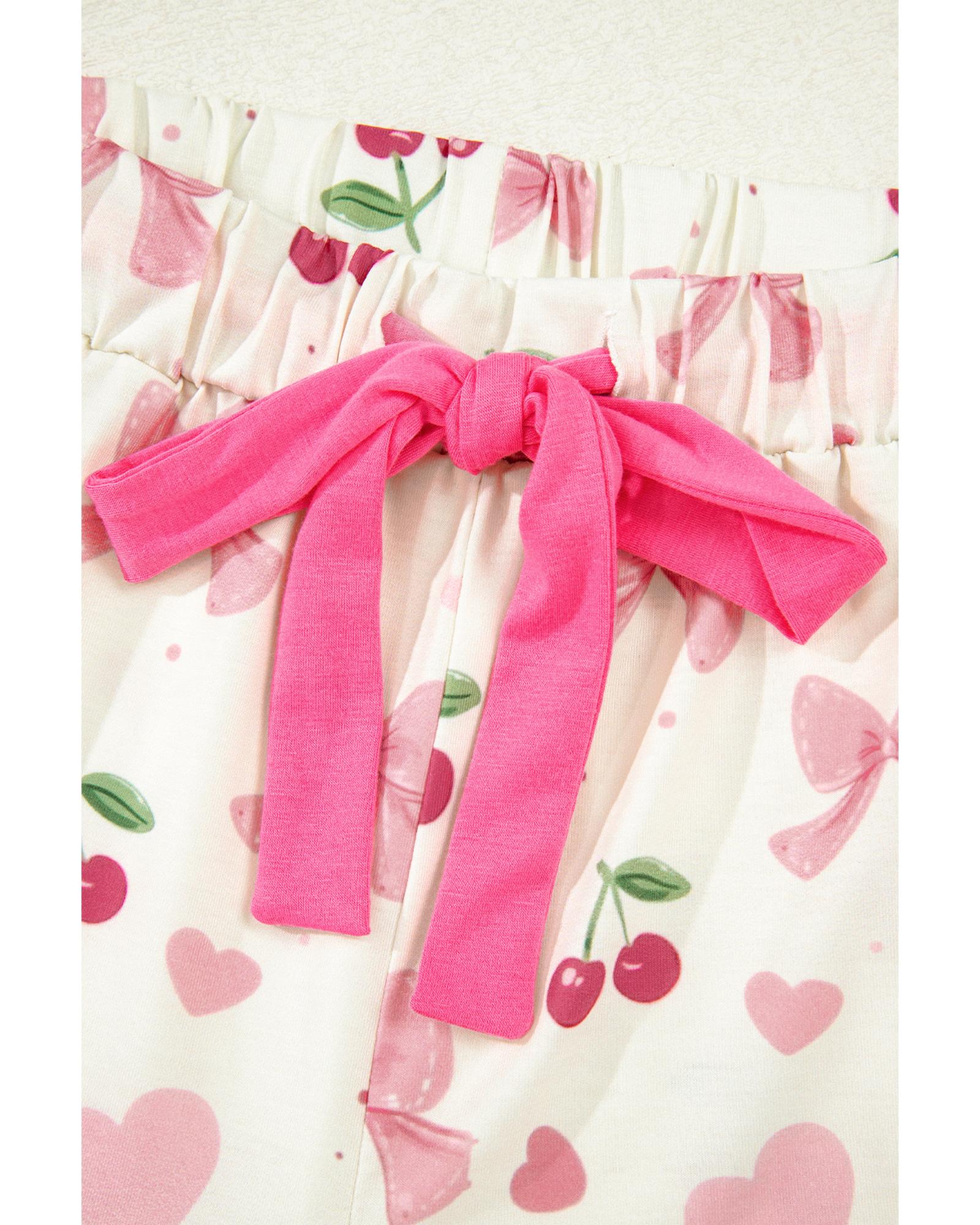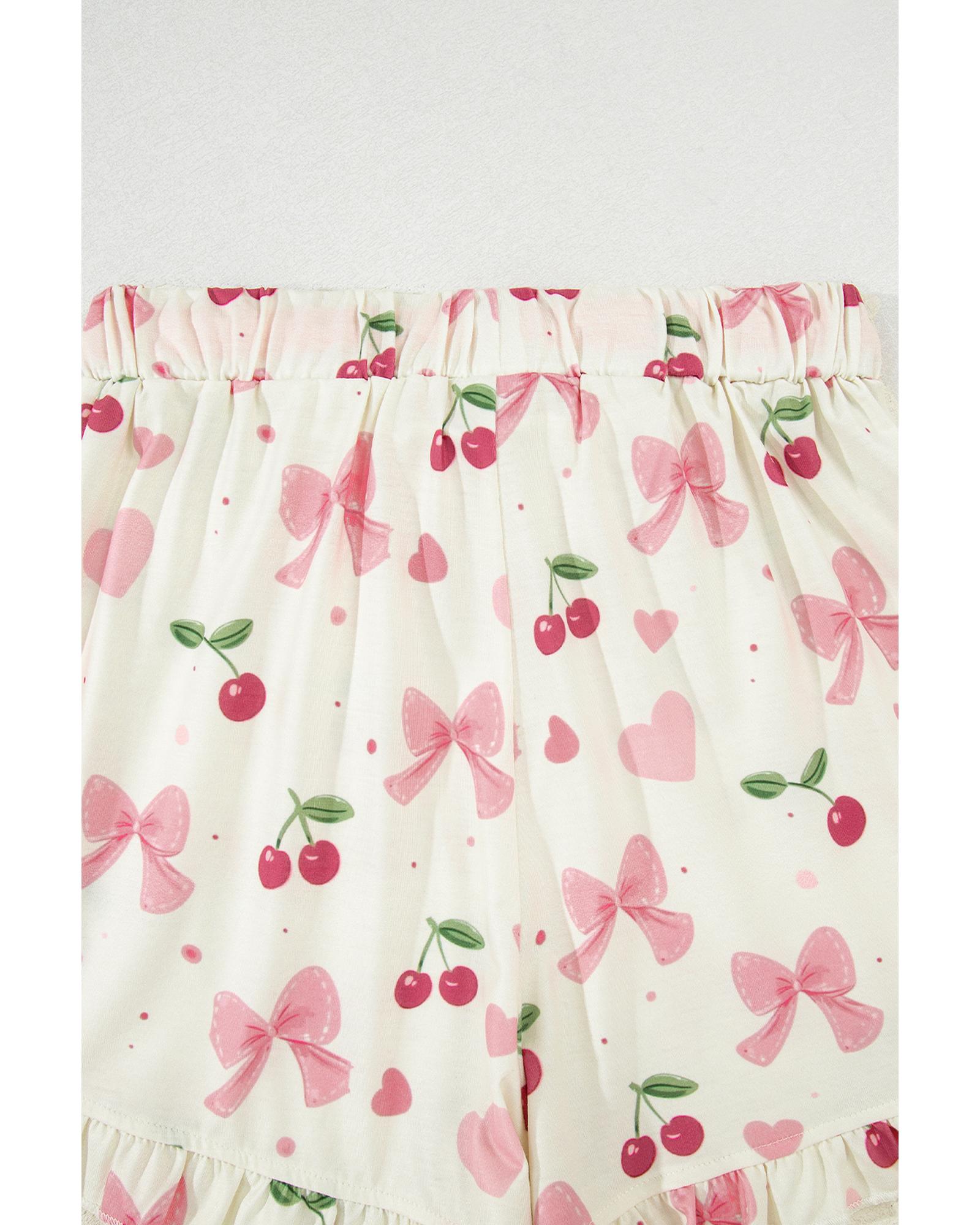 Beige Bow Fruit Print Contrast Pipping Short Pajamas Set – M
