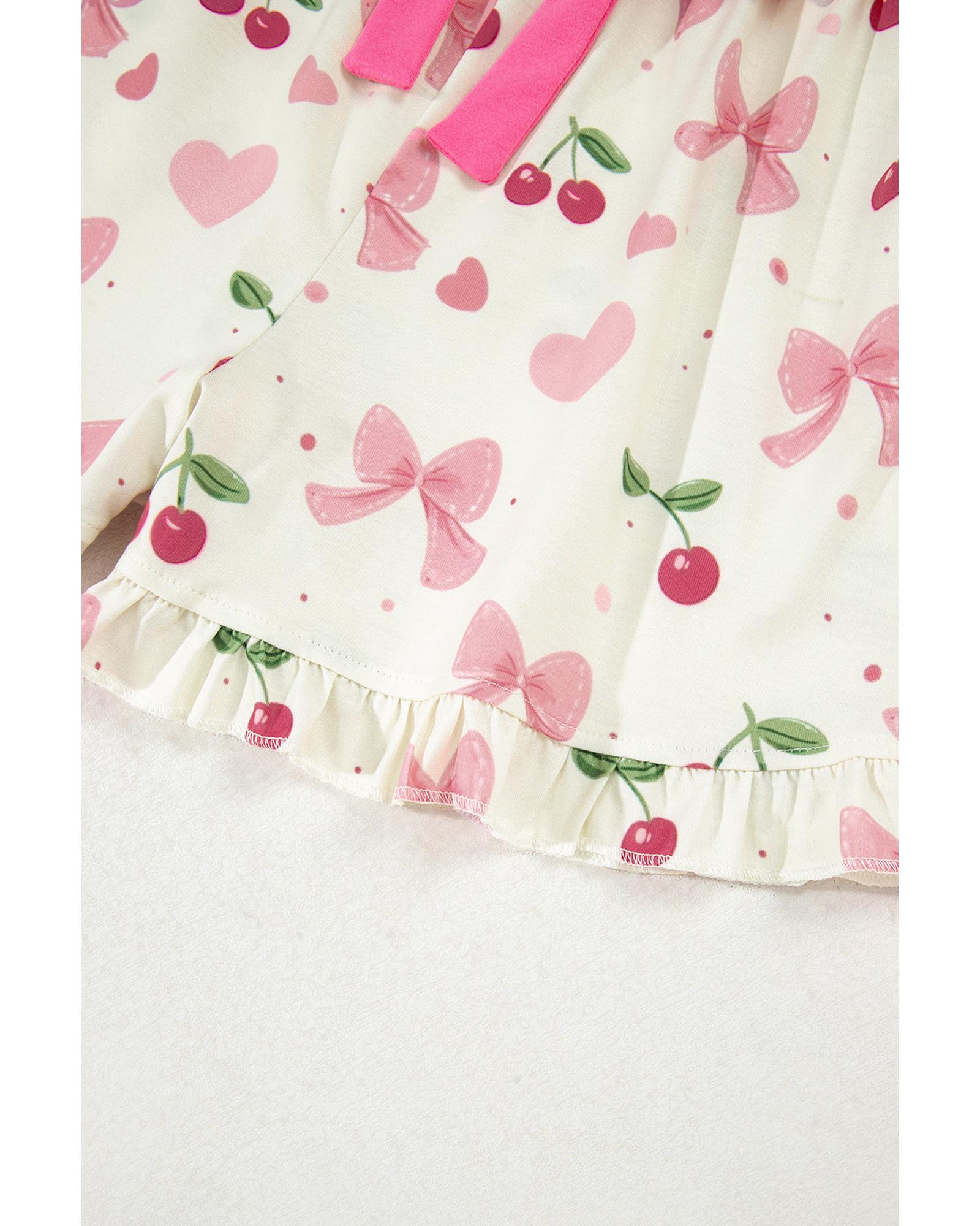 Beige Bow Fruit Print Contrast Pipping Short Pajamas Set – S