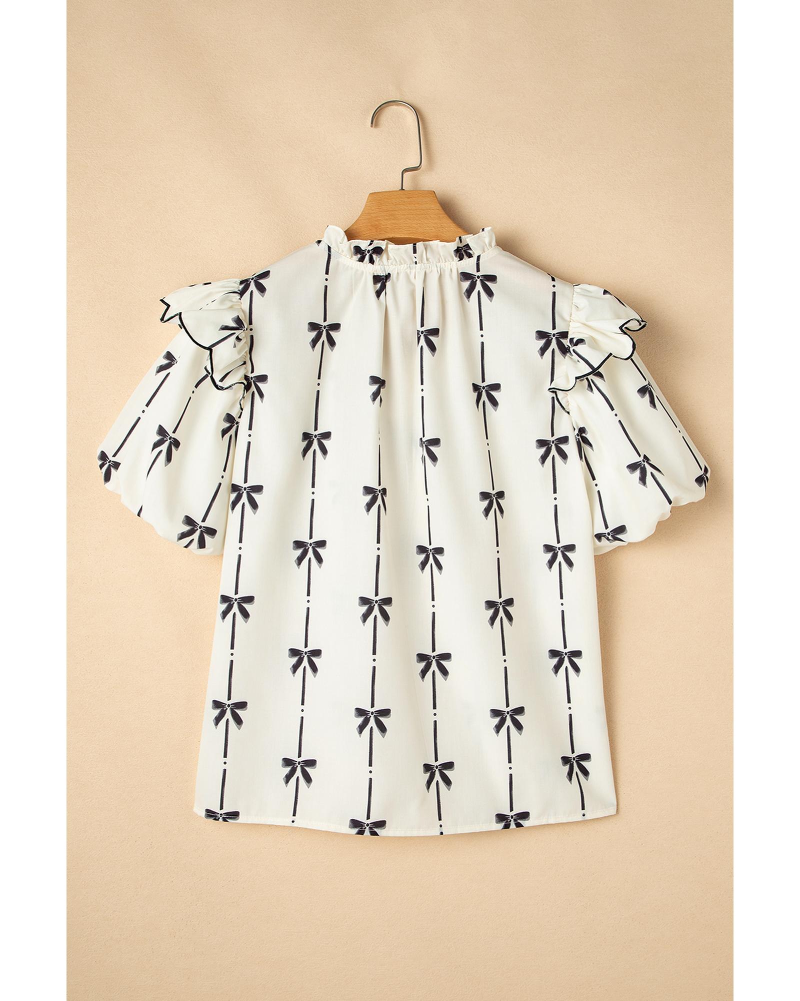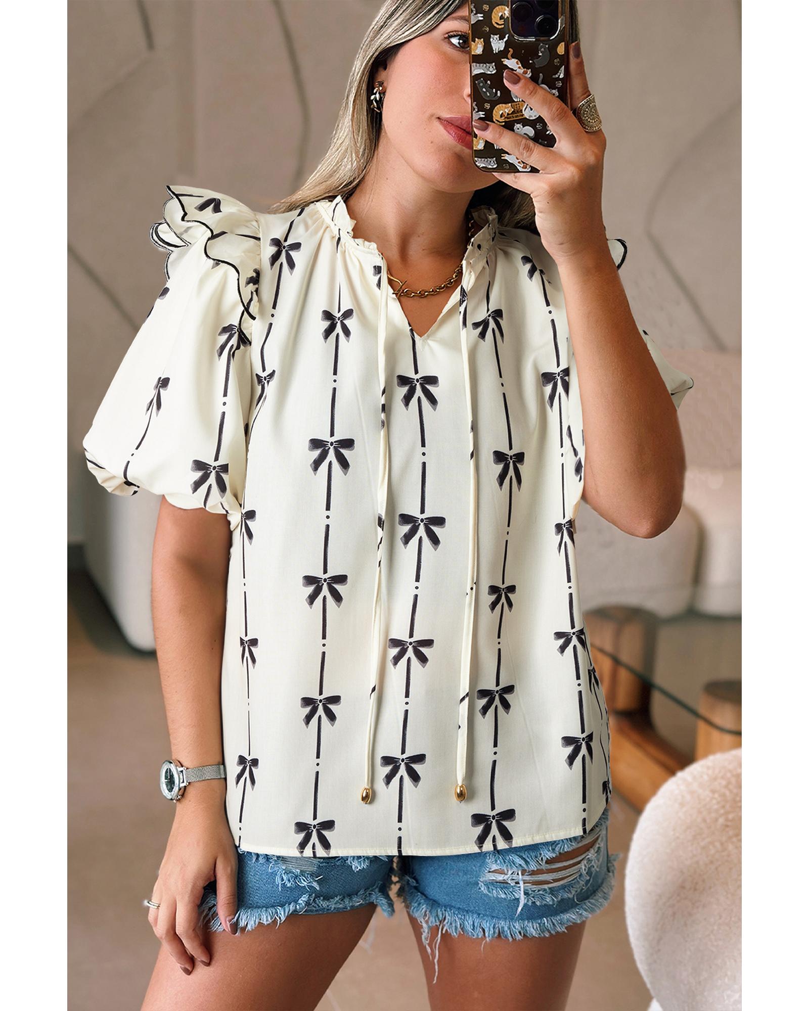 Beige Bow Printed Ruffled Bubble Sleeve Tied Notched V Neck Blouse – S