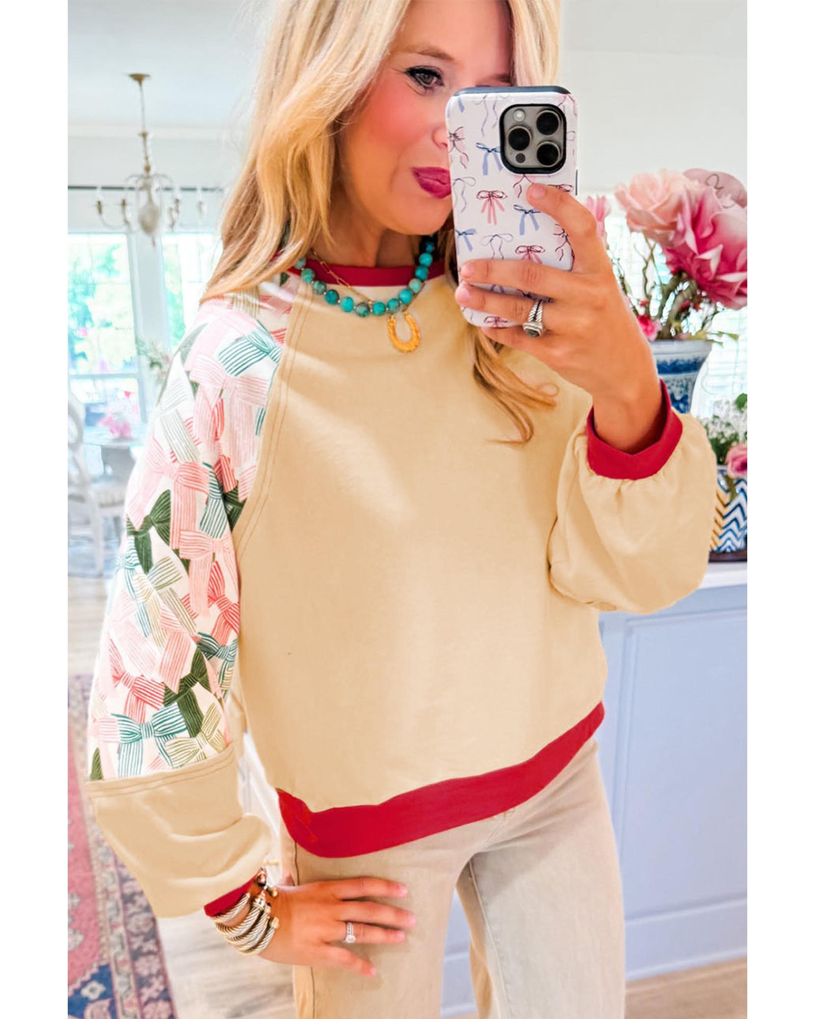 Beige Bowknot Printed Patchwork Raglan Sleeve Colorblock Edge Top – XL