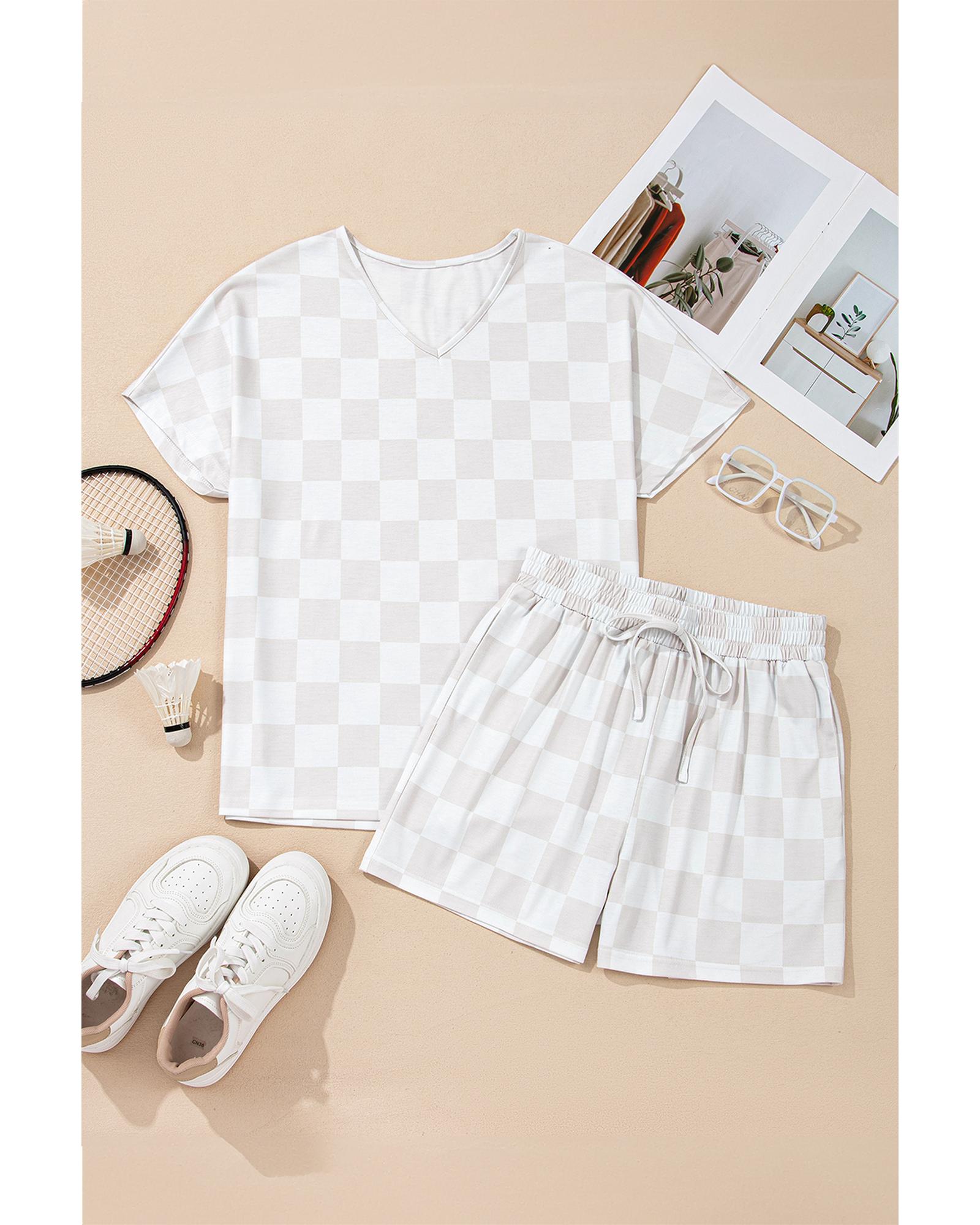 Beige Checkered V Neck Tee Drawstring Shorts Lounge Set – S